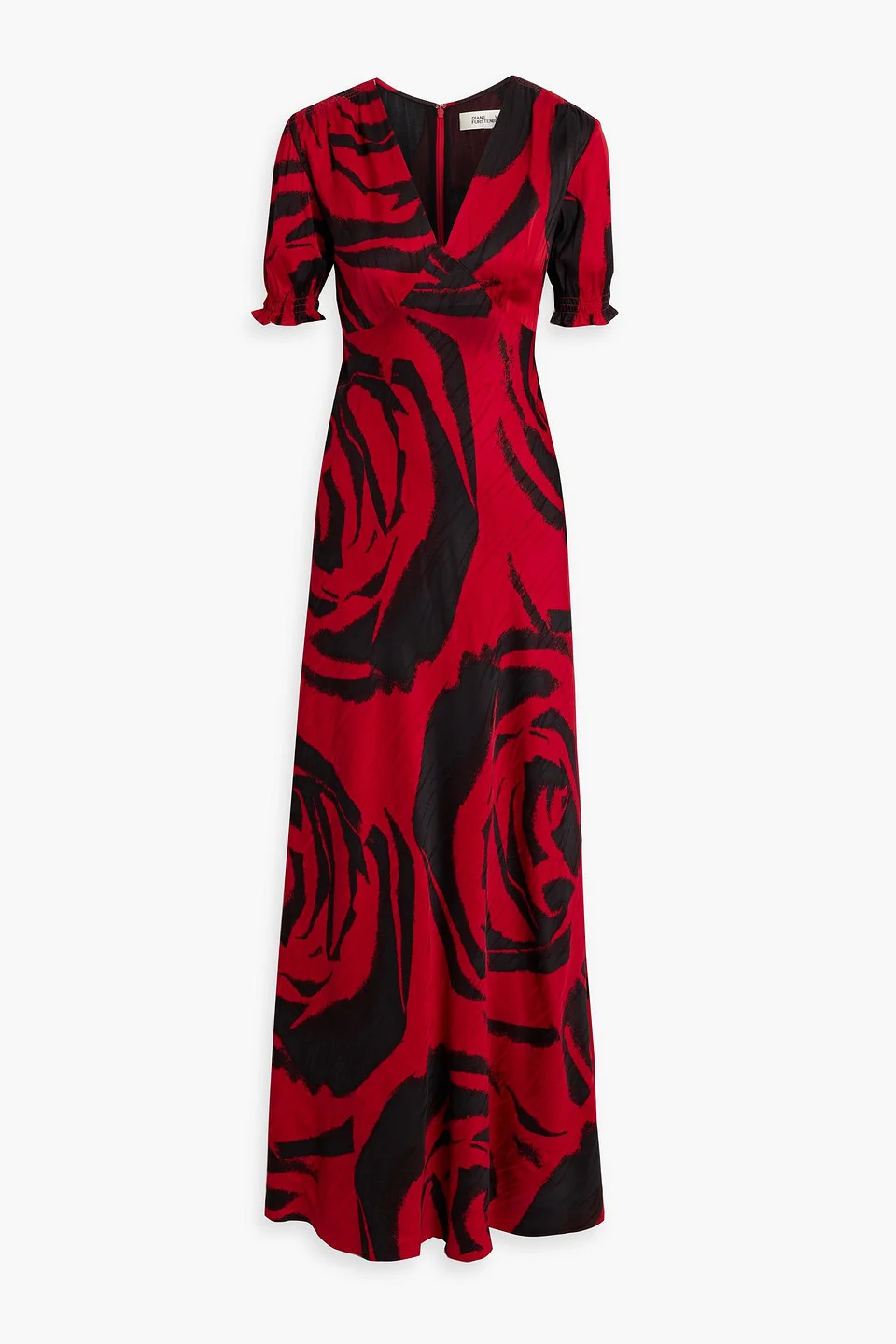 Dress printed satin-jacquard shirred concealed hook and zip fastening at back stretchy fabric mid-weight fabric dry clean imported 53% Rayon 47% Viscose Product Code 1647597308755317