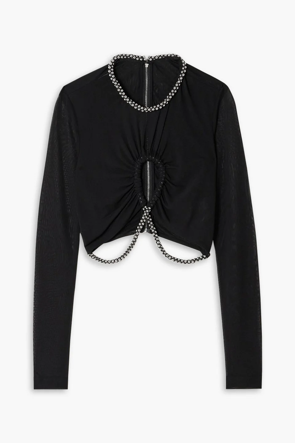 Top mesh beads cropped cutout zip fastening through back lightweight, slightly stretchy fabric dry clean imported Dion Lee's designs are filled with subtle textural elements that feel so contemporary. This 'Barball' top is cut from lightweight mesh and embellished with beaded ropes along the neck, waist and keyhole cutout. 77% Viscose 23% Polyester Product Code 1647597322153844