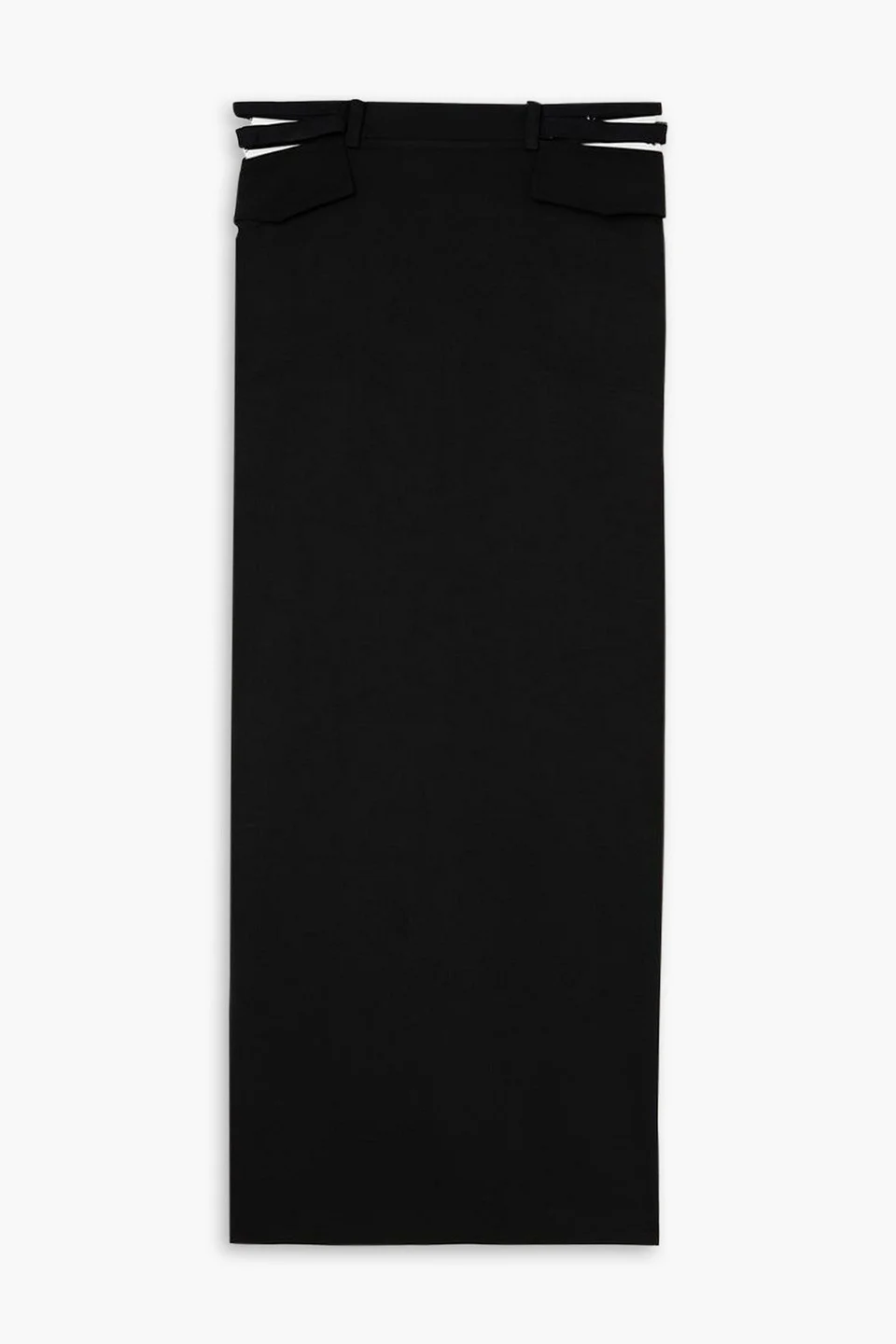 Skirt crepe buckled waist tabs two side slit pockets back split concealed hook and zip fastening at back lightweight, slightly stretchy fabric dry clean imported Dion Lee's maxi skirt evokes the '90s with its minimal aesthetic and column silhouette. Made from crepe, it has flap pockets and skin-baring straps along the low-rise waist. 100% Polyester Product Code 1647597322153840
