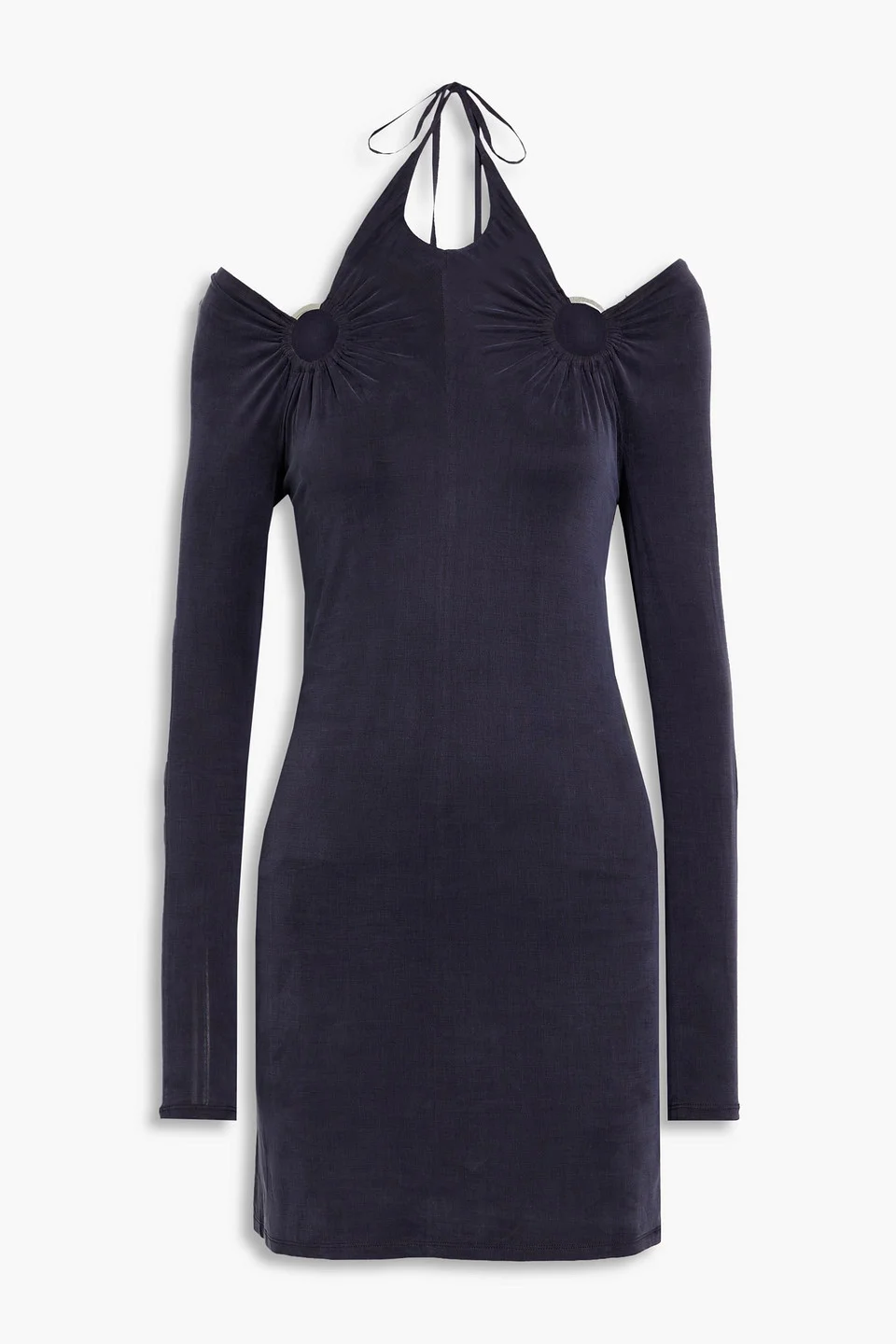 Dress brushed synthetic material cupro-blend ring embellishment ties at neck fully lined dry clean imported 93% Cupro 7% Elastane Product Code 1647597288339603