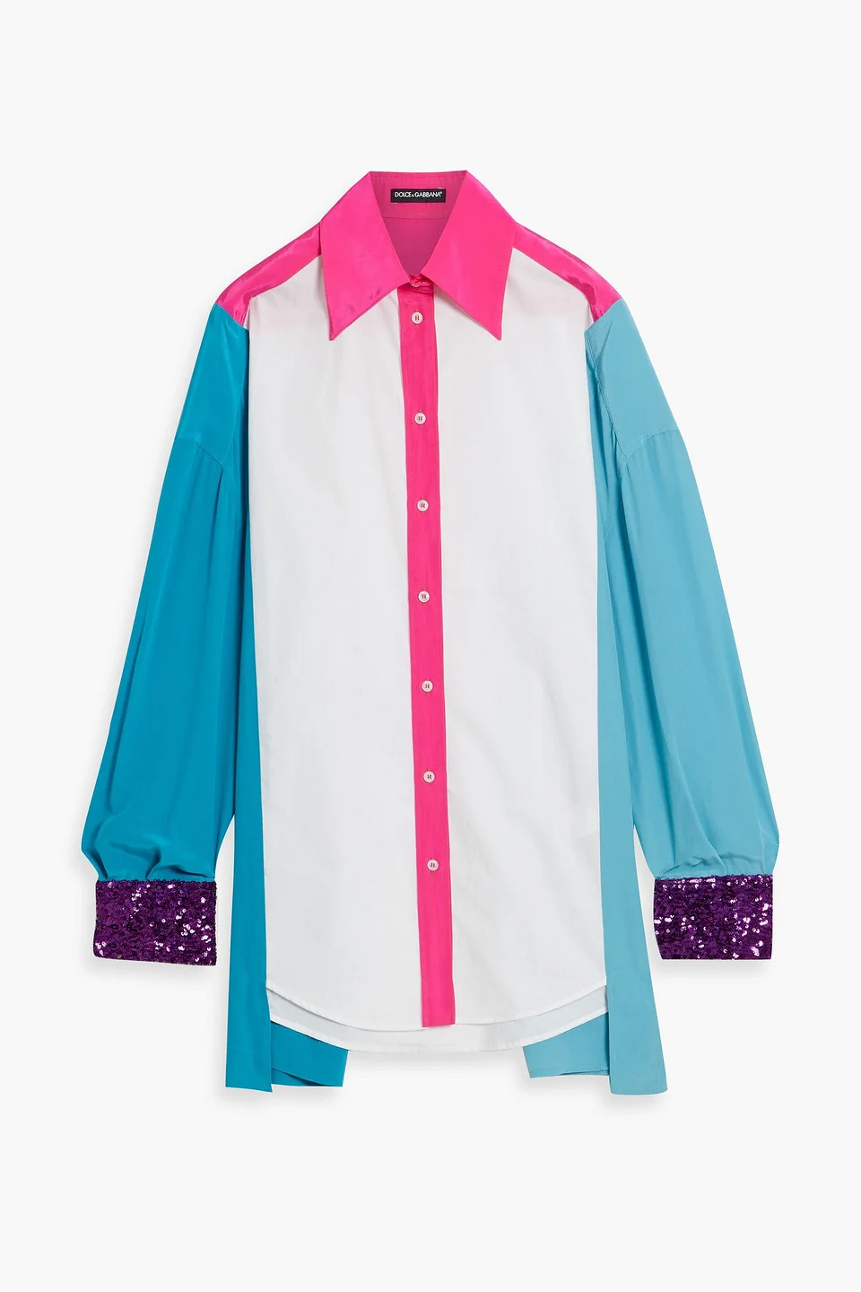 Shirt color-block crepe de chine poplin paneled sequins pleated back buttoned cuffs asymmetric hem button fastenings through front lightweight, non-stretchy fabric dry clean made in italy 40% Cotton 30% Silk 17% Viscose 9% Polyamide 4% Other Fibres Product Code 1647597357764003
