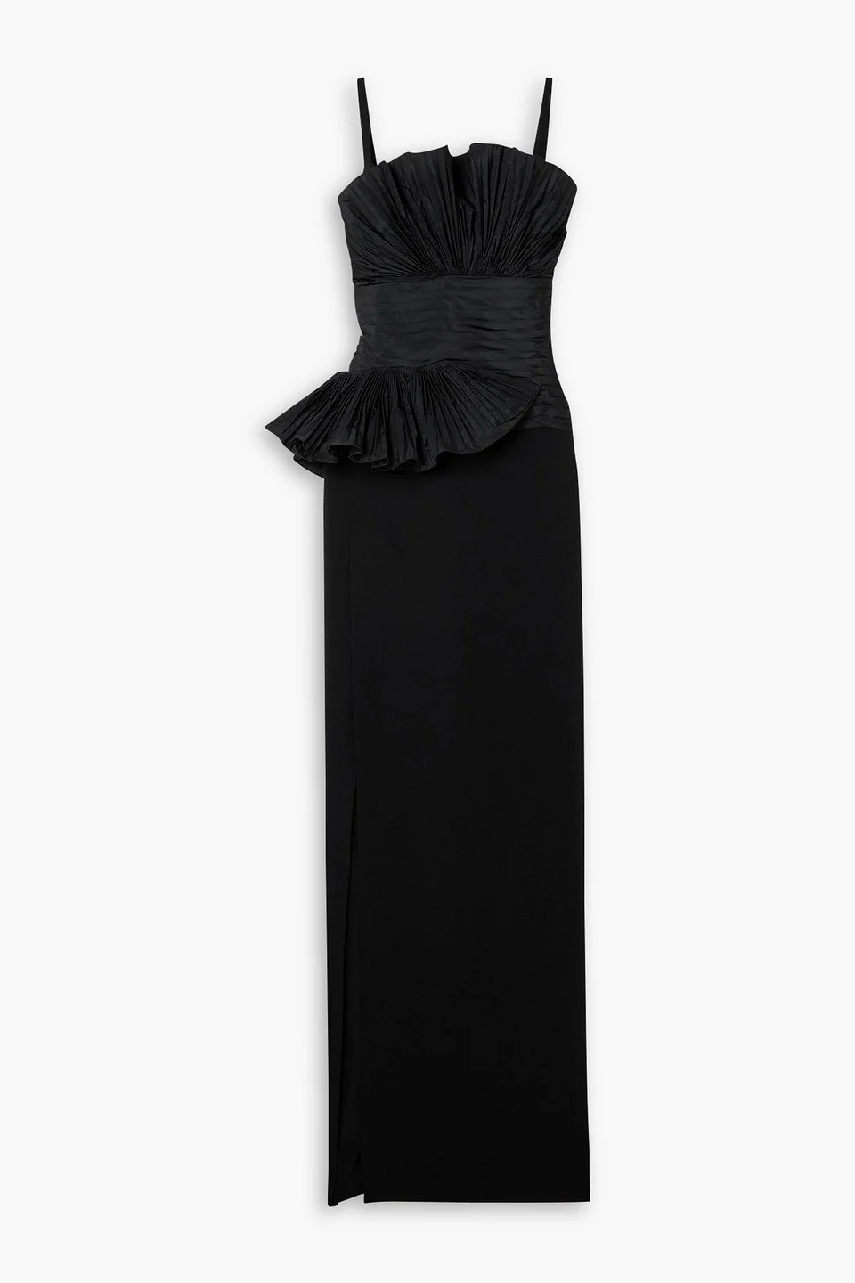 Gown taffeta crepe paneled pleated ruffled front split concealed hook and zip fastening at back fully lined mid-weight, non-stretchy fabric dry clean imported Elie Saab’s black gown (first seen on the runway) has a fan-shaped taffeta bodice that beautifully frames your face and waist. The skirt is made from crepe and spliced with a thigh split to show off some skin … and some fabulous heels. 36% Silk 27% Polyester 20% Viscose 17% Acetate Product Code 1647597317878356