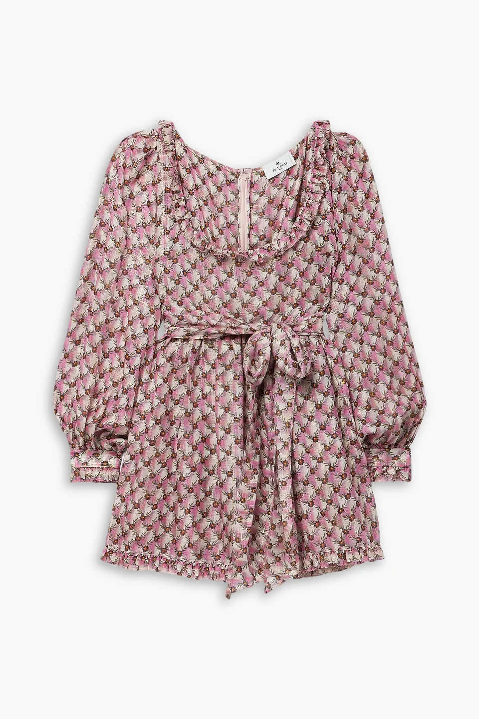 Belted ruffled floral-print metallic silk crepe de chine mini dress