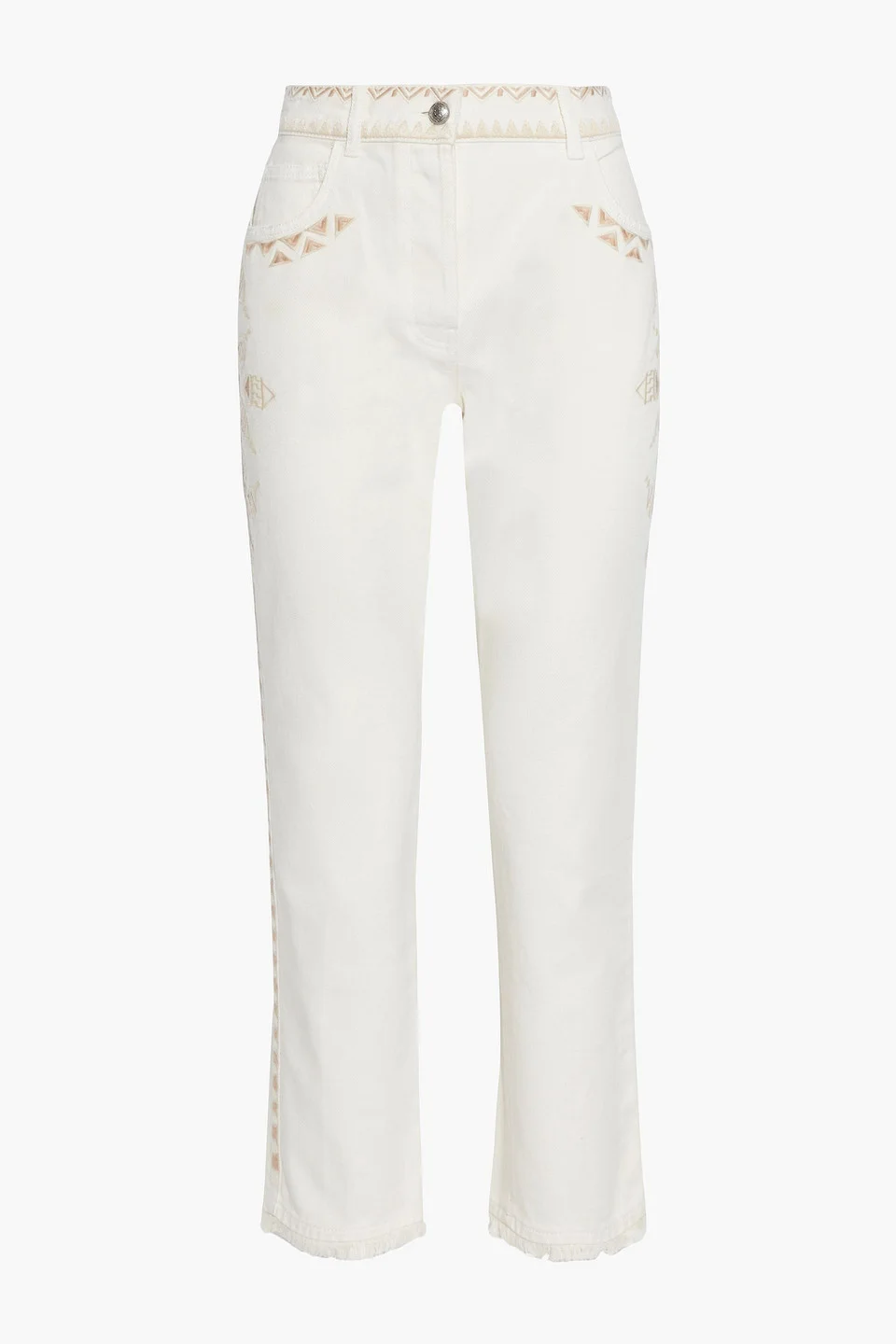 Slim-leg jeans denim embroidered cropped multipockets belt loops high-rise cut partially concealed button fastenings along front frayed hem non-stretchy fabric mid-weight fabric machine wash or dry clean made in italy 100% Cotton Product Code 27086482324004041