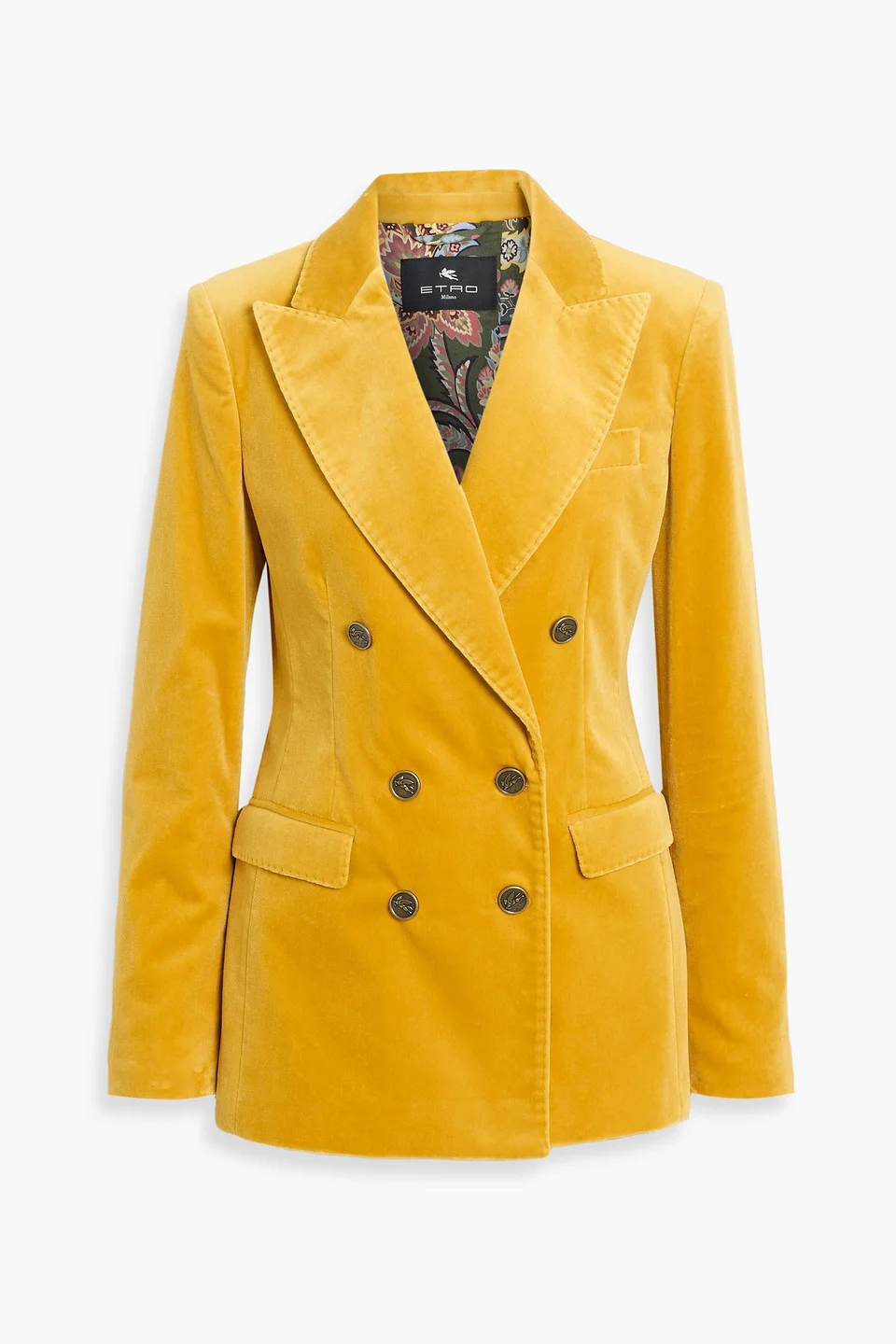 Blazer cotton-blend velvet shoulder pads buttoned cuffs breast pocket front flap pockets button fastenings through double-breasted front fully lined back vent mid-weight, slightly stretchy fabric dry clean made in italy 99% Cotton 1% Elastane Product Code 46376663163077242