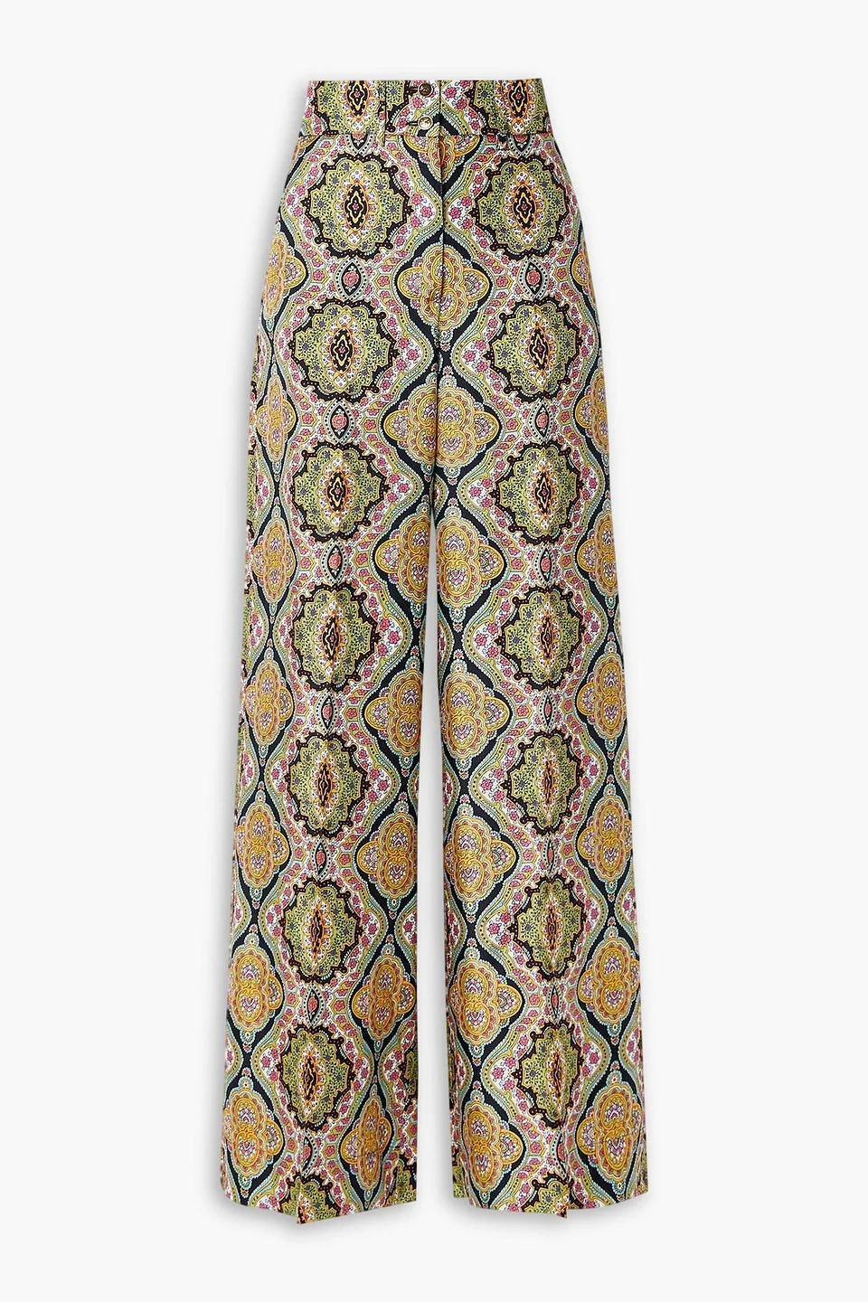 Wide-leg pants printed silk-twill pressed creases side slant pockets back welt pocket belt loops high-rise cut button and concealed zip fastenings at front lightweight, non-stretchy fabric dry clean made in italy 100% Silk Product Code 46376663163077330