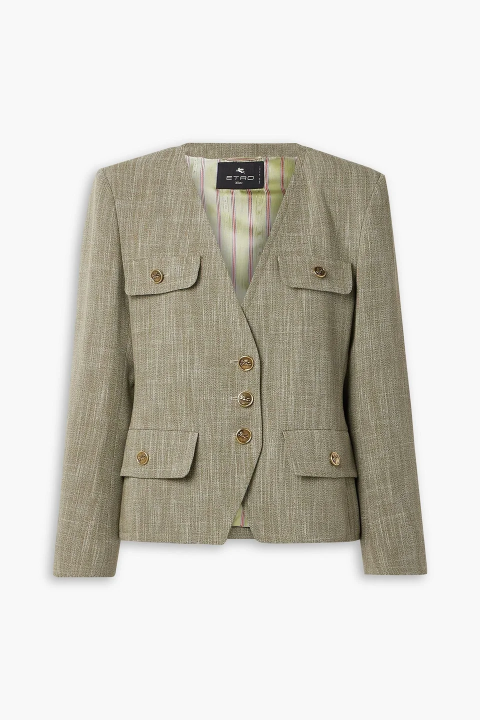 Blazer woven shoulder pads buttoned cuffs faux pockets front flap pockets button fastenings through front fully lined mid-weight, non-stretchy fabric dry clean made in italy 86% Viscose 14% Polyester Product Code 46376663163076996