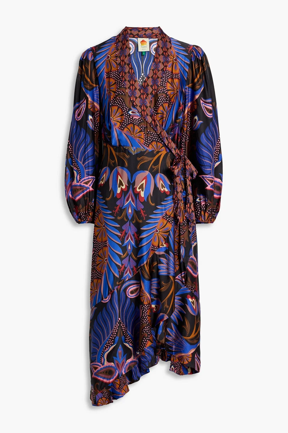 Asymmetric printed satin midi wrap dress