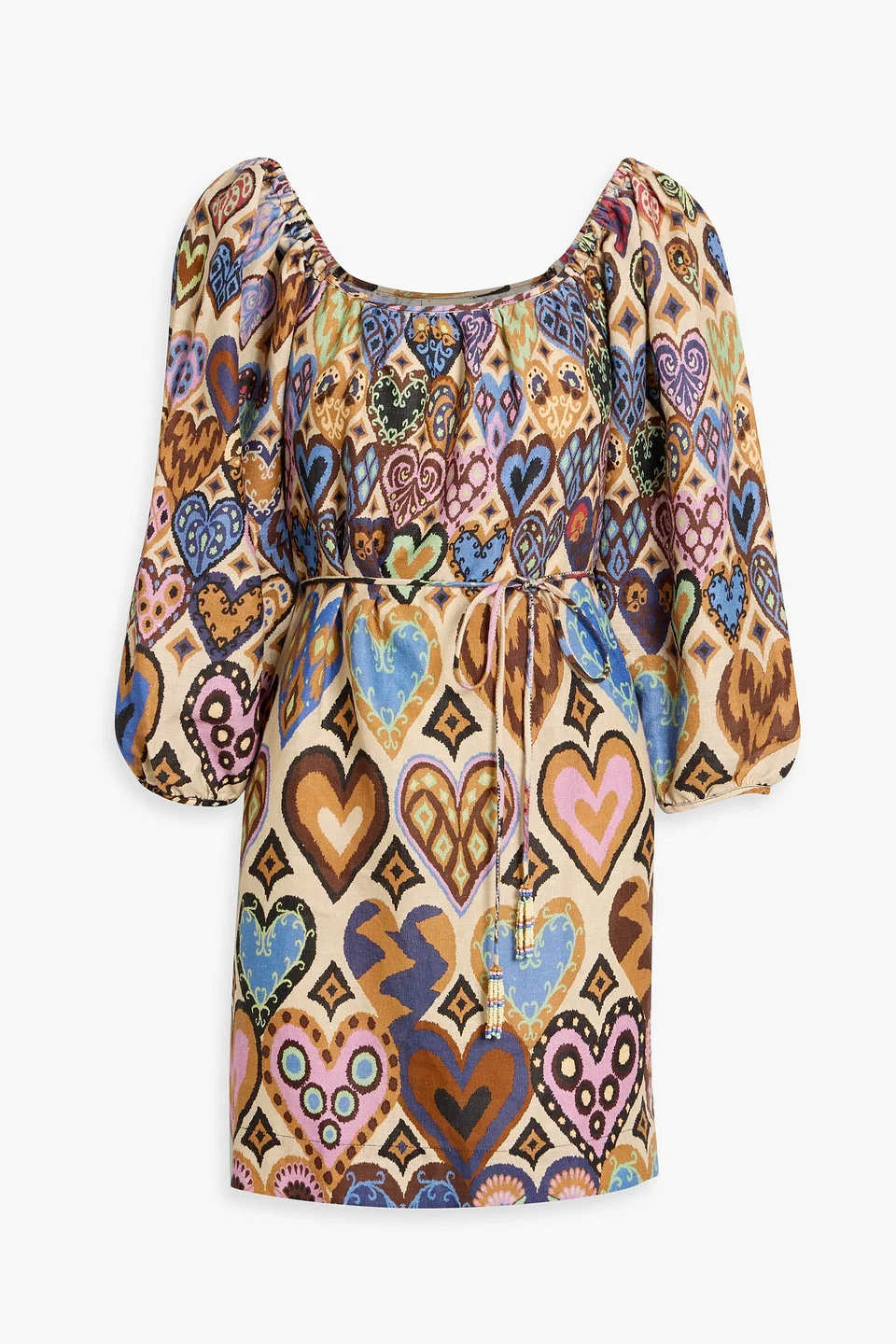 Dress printed linen-canvas beads elasticated shoulders detachable waist tie puffed sleeves side slit pockets slips on mid-weight, non-stretchy fabric machine wash imported 100% Linen Product Code 46376663162992653