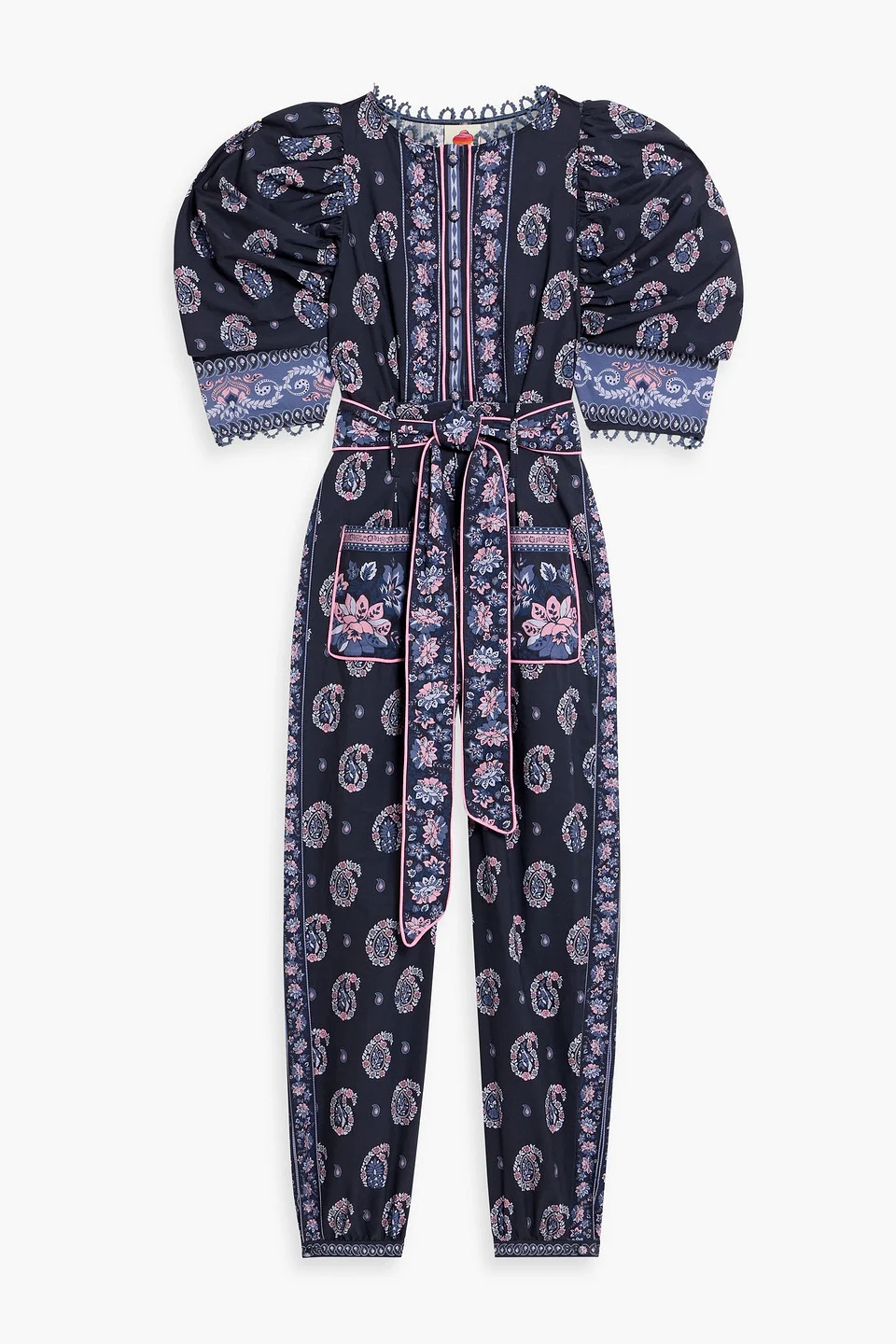 Jumpsuit printed cotton-poplin crochet trims detachable waist tie puffed sleeves front patch pockets button fastenings along front concealed zip fastening along front mid-weight, non-stretchy fabric dry clean imported 100% Cotton Product Code 46376663162990685