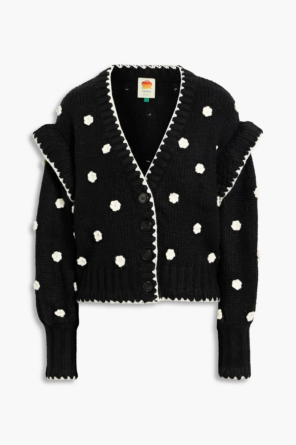 Cardigan ribbed-knit floral appliques ruffled button fastenings through front chunky knit dry clean imported 100% Acrylic Product Code 46376663162991611