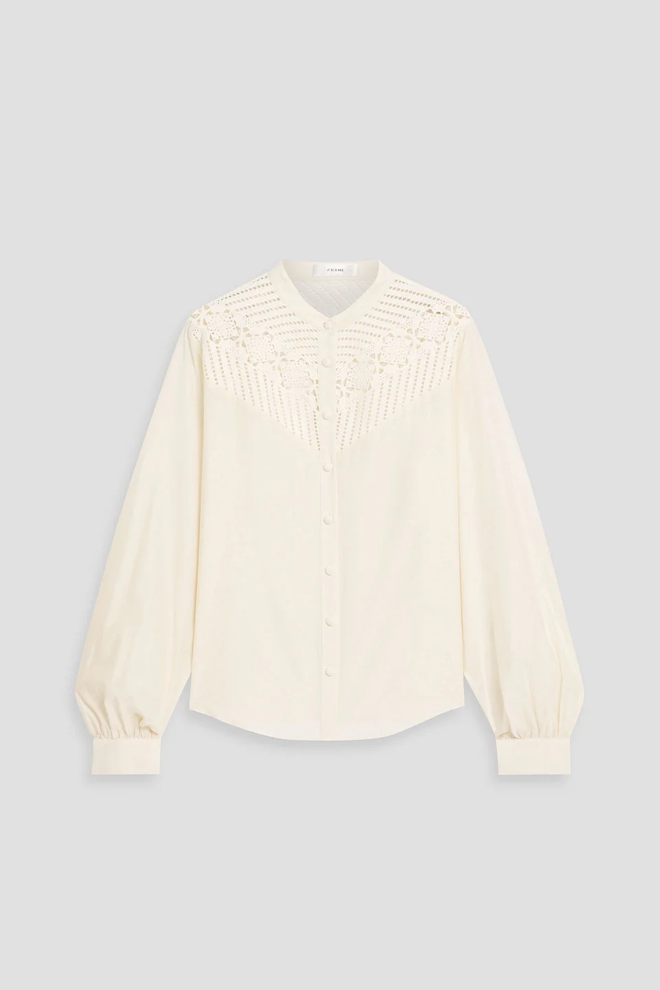 Top crochet cotton and silk-blend paneled buttoned cuffs button fastenings through front mid-weight, non-stretchy fabric dry clean imported 80% Cotton 20% Silk Product Code 46376663163036303