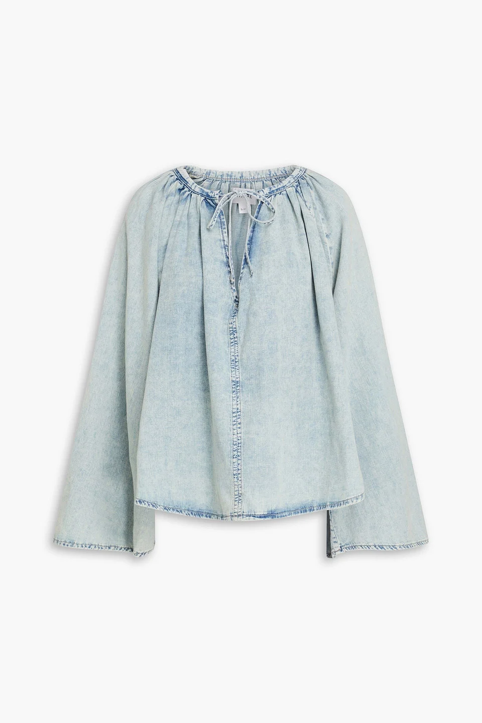 Blouse faded chambray cotton and linen-blend gathered tie-fastening keyhole at front mid-weight, non-stretchy fabric dry clean imported 83% Cotton 17% Linen Product Code 1647597325681885