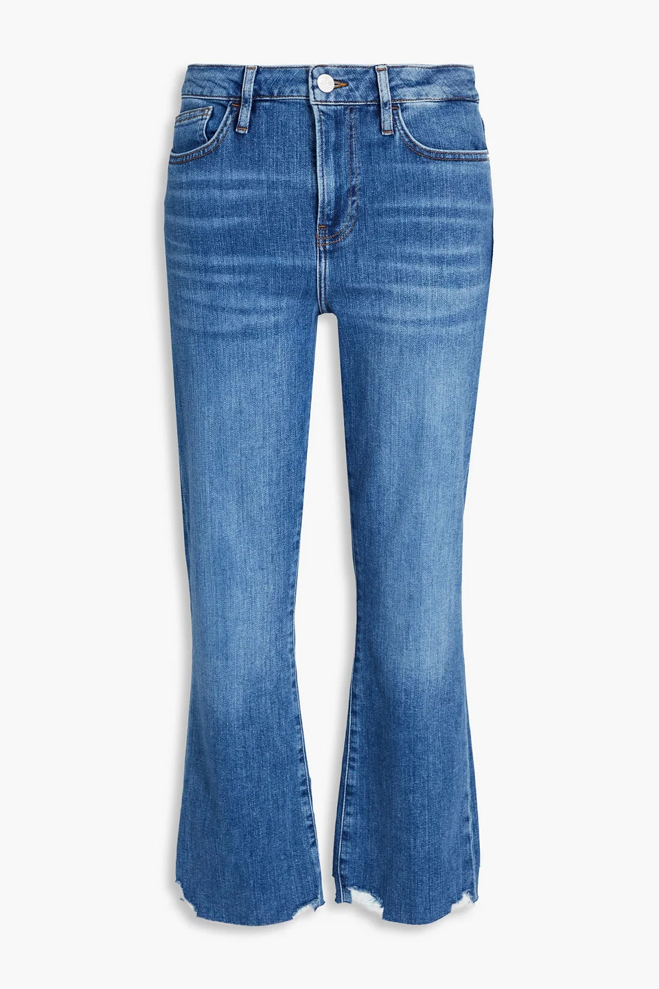 Bootcut jeans faded denim cropped belt loops high-rise cut five pockets button and concealed zip fastening at front distressed cuffs mid-weight, stretchy fabric machine wash designer wash: jetty imported 77% Cotton 18% Rayon 4% Elasterell-p 1% Elastane Product Code 46376663162867796