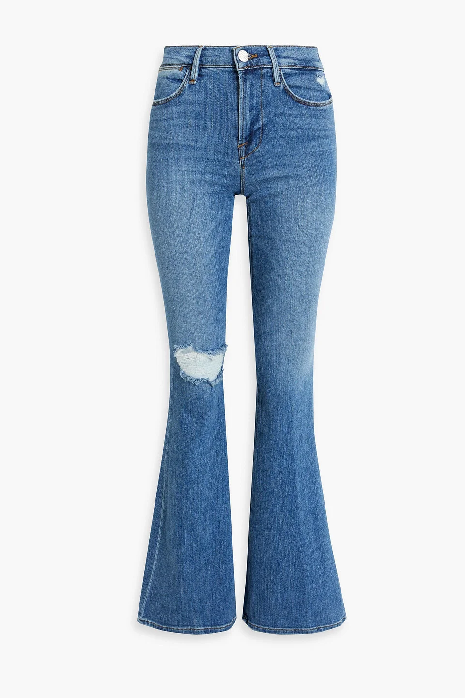 Flared jeans denim distressed belt loops high-rise cut multipockets button and concealed zip fastening at front slightly stretchy fabric mid-weight fabric machine wash imported 77% Cotton 19% Modal 3% Elastercell 1% Elastane Product Code 1647597324617724