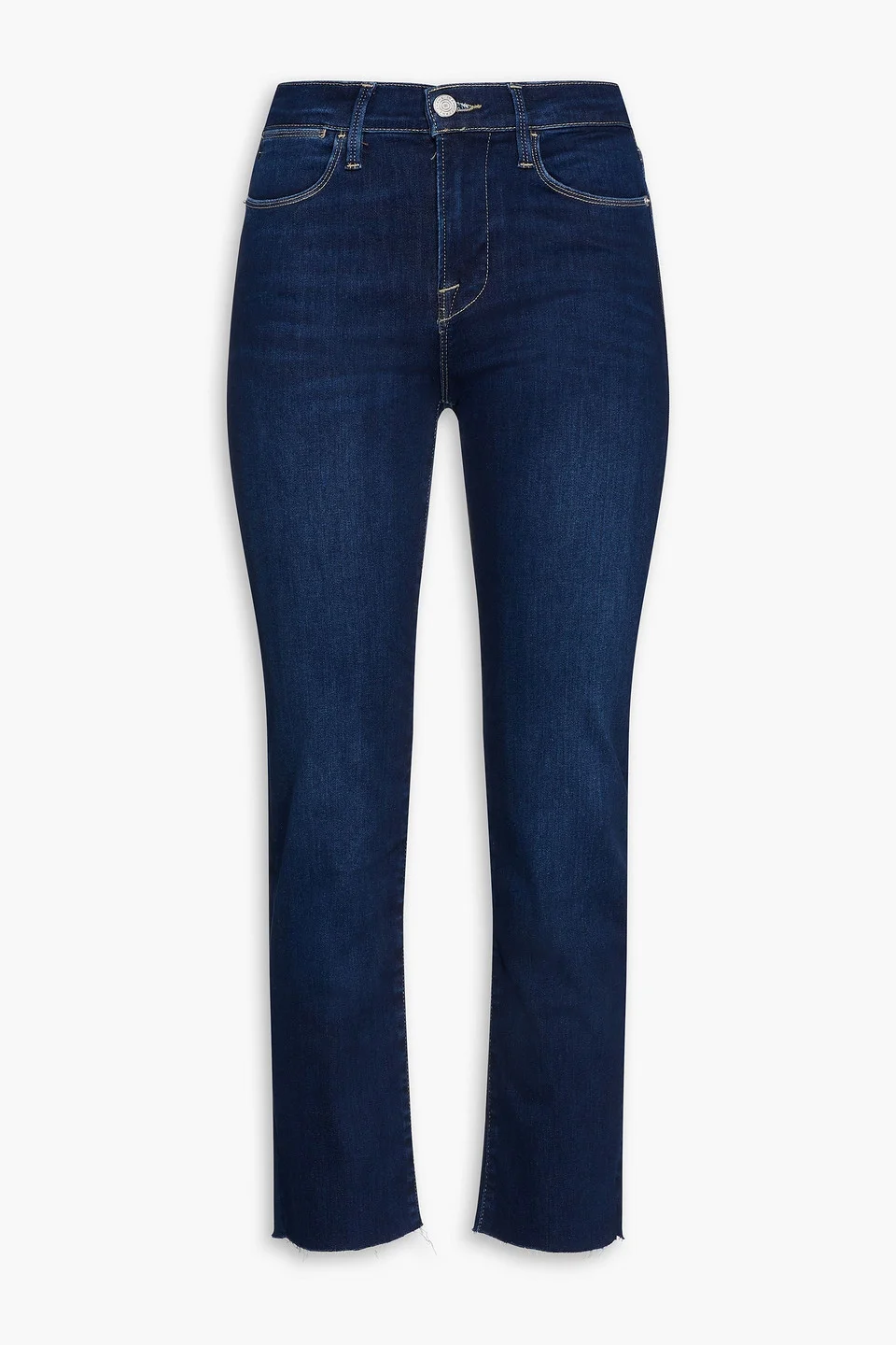 Straight-leg jeans denim cropped belt loops high-rise cut multipockets button and concealed zip fastening at front frayed hem stretchy fabric mid-weight fabric machine wash or dry clean imported 67% Cotton 13% Pre-consumer recycled cotton 11% Lyocell 5% Elasterell-p 4% Elastane Product Code 1647597289883991