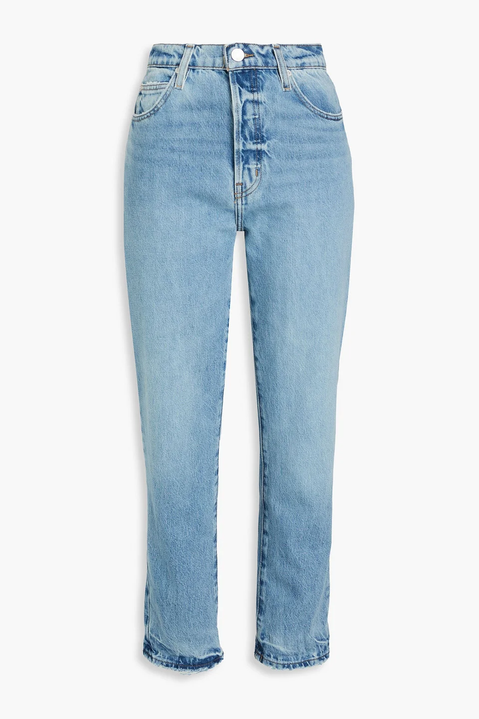 Straight-leg jeans faded denim distressed trims belt loops high-rise cut five pockets partially concealed button fastenings along front mid-weight, non-stretchy fabric machine wash imported 80% Regenerated cotton 20% Post-consumer recycled cotton Product Code 1647597351283230