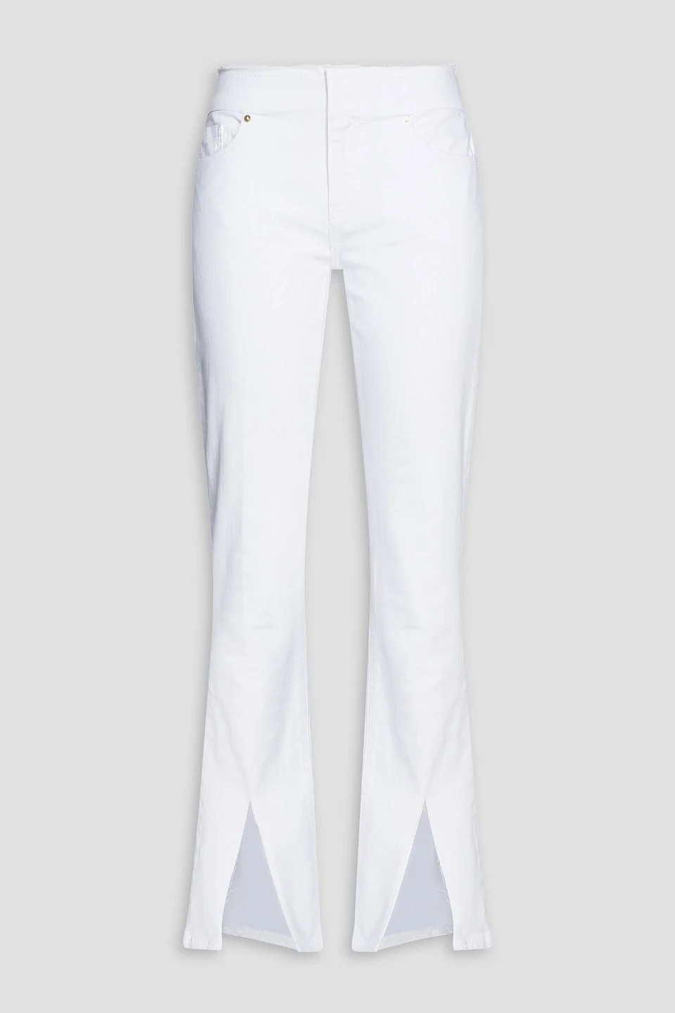 Bootcut jeans denim frayed trims high-rise cut multipockets concealed hook, button and zip fastening at front two front splits slightly stretchy fabric mid-weight fabric machine wash imported 79% Cotton 20% Pre-consumer recycled cotton 1% Elastane Product Code 1647597290843744