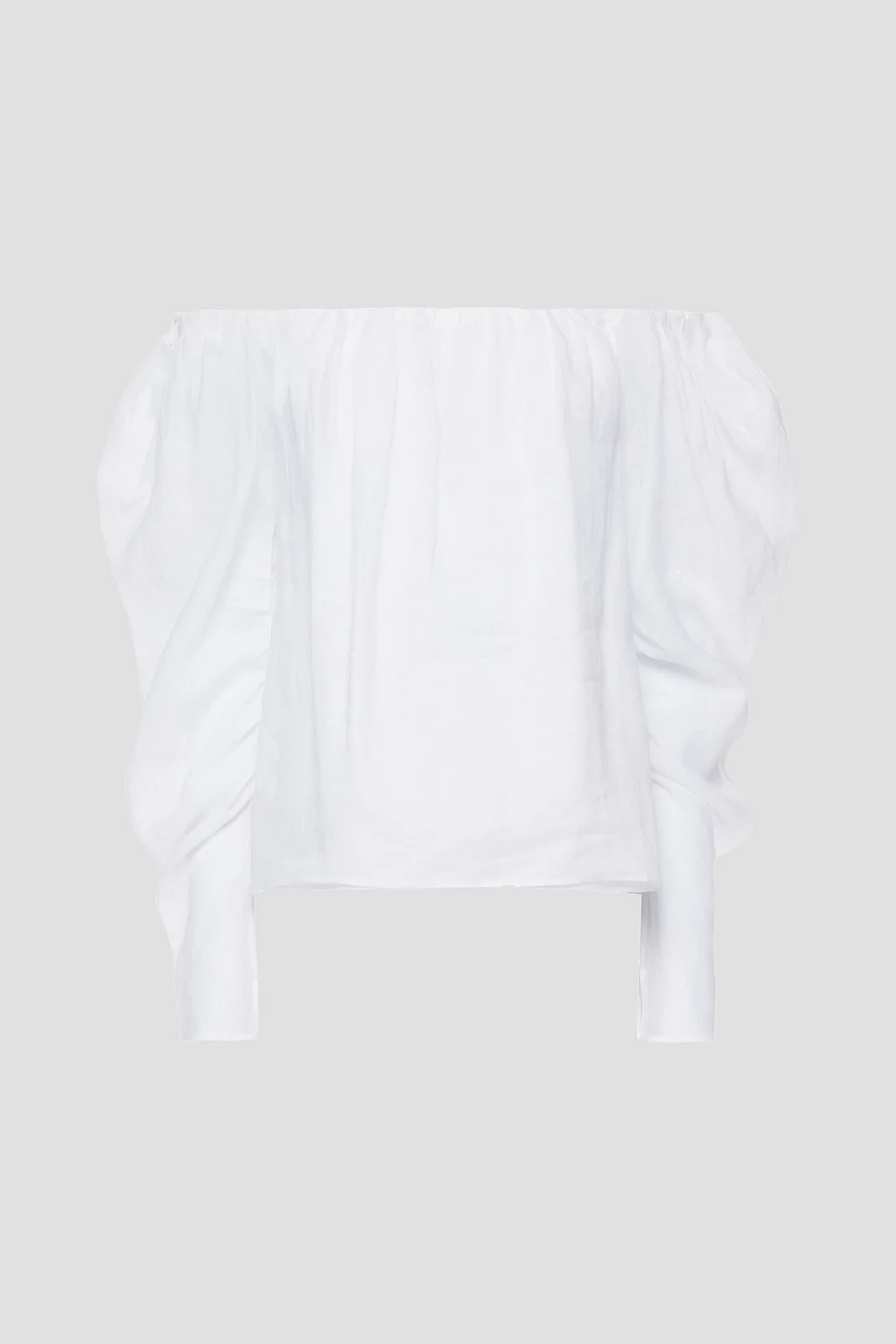 Off-the-shoulder top mousseline ramie elasticated neckline gathered cropped ruched sleeves partially lined non-stretchy fabric mid-weight fabric dry clean imported 100% Ramie Product Code 29419655932233136