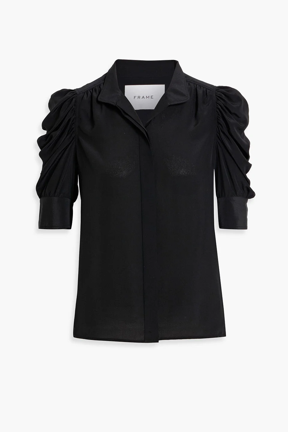 Top silk crepe de chine ruched sleeves concealed button fastenings through front mid-weight, non-stretchy fabric dry clean imported The Gillian' top by Frame is just the thing to pair with jeans and mules for a night out, or a midi skirt and pumps for an in-office day. Made from silk crepe de chine, it has ruched sleeves for a bit of volume to balance out its sleek silhouette. 100% Silk Product Code 1647597346187700