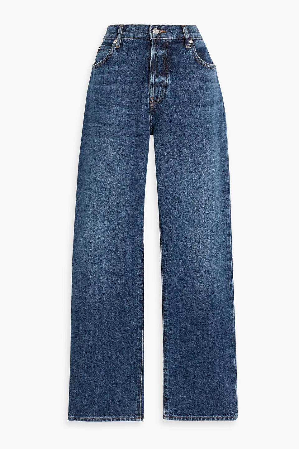 Straight-leg jeans denim belt loops high-rise cut five pockets button and concealed zip fastening at front mid-weight, non-stretchy fabric machine wash or dry clean designer wash: hitched imported 100% Regenerated cotton Product Code 1647597358619689
