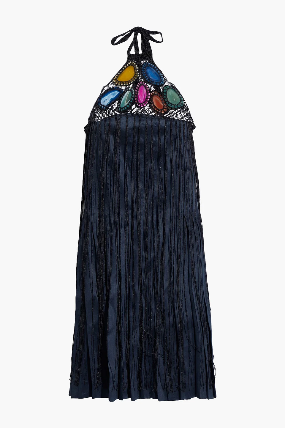 Dress macrame agate paneled linen and silk-blend paneled pleated fringed ties at neck concealed hook and zip fastening at back fully lined non-stretchy fabric mid-weight fabric dry clean made in italy 71% Linen 29% Silk Product Code 38063312420045581