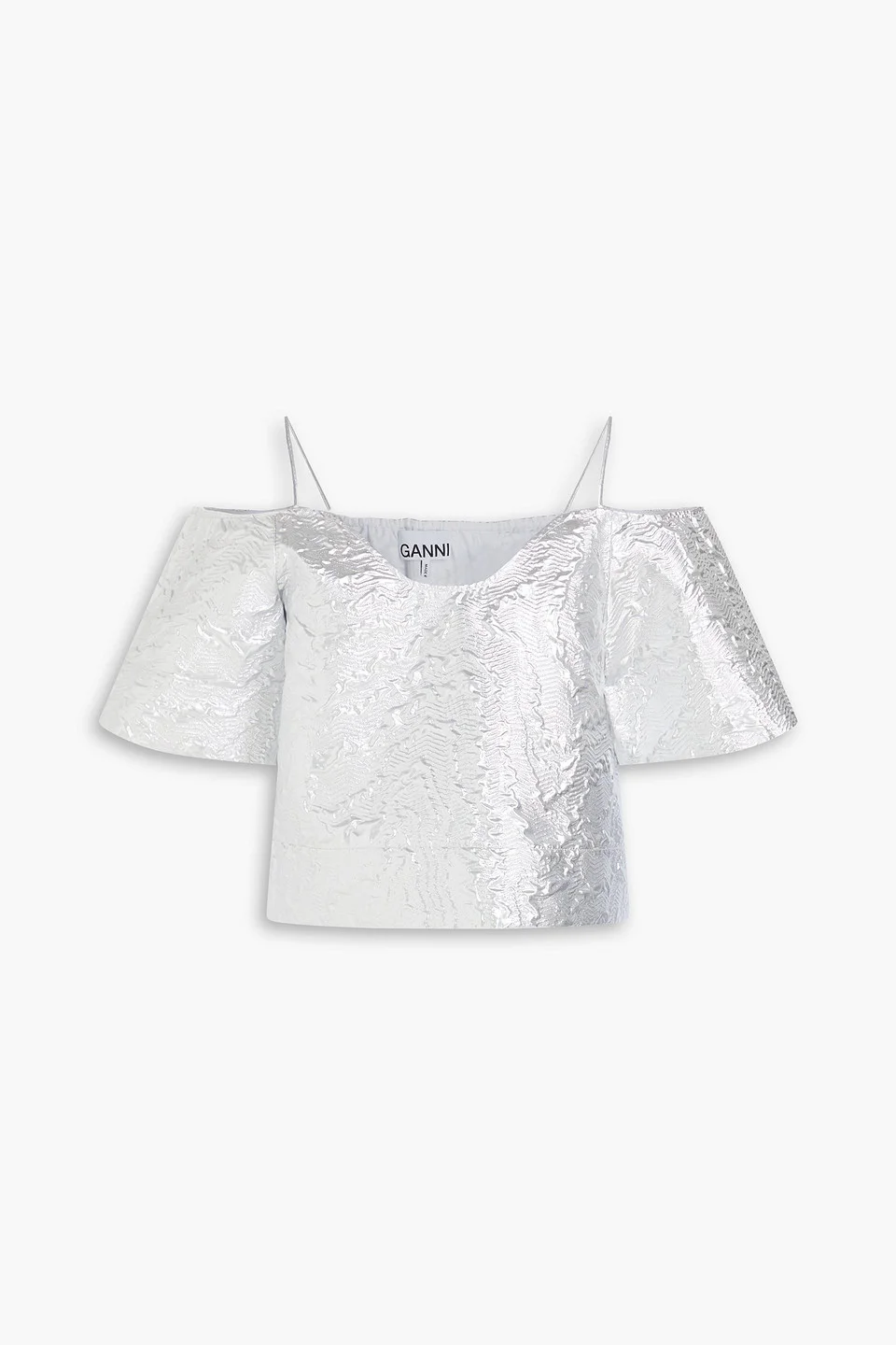 Cold-shoulder top metallic cloque cotton-blend cropped slips on non-stretchy fabric mid-weight fabric machine wash imported 50% Organic Cotton 29% Metallic fiber 21% Polyamide Product Code 1647597336590474