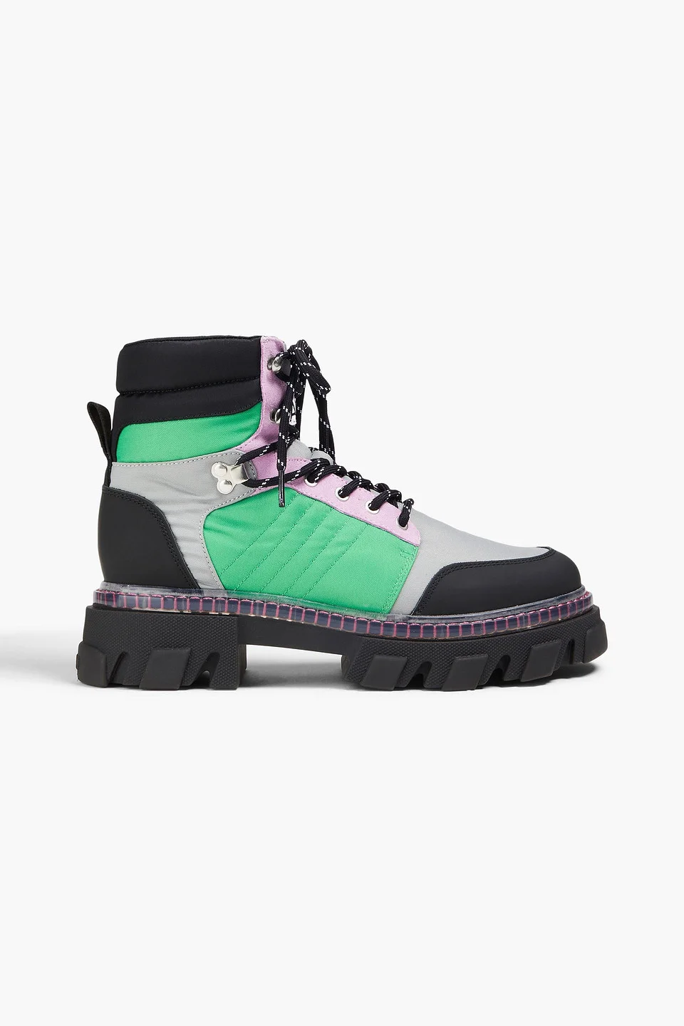 Hiking boots color-block shell synthetic material suede round toe lace-up front rubber lug sole imported 65% Recycled polyamide 35% Calf-skin leather Product Code 1647597336466982