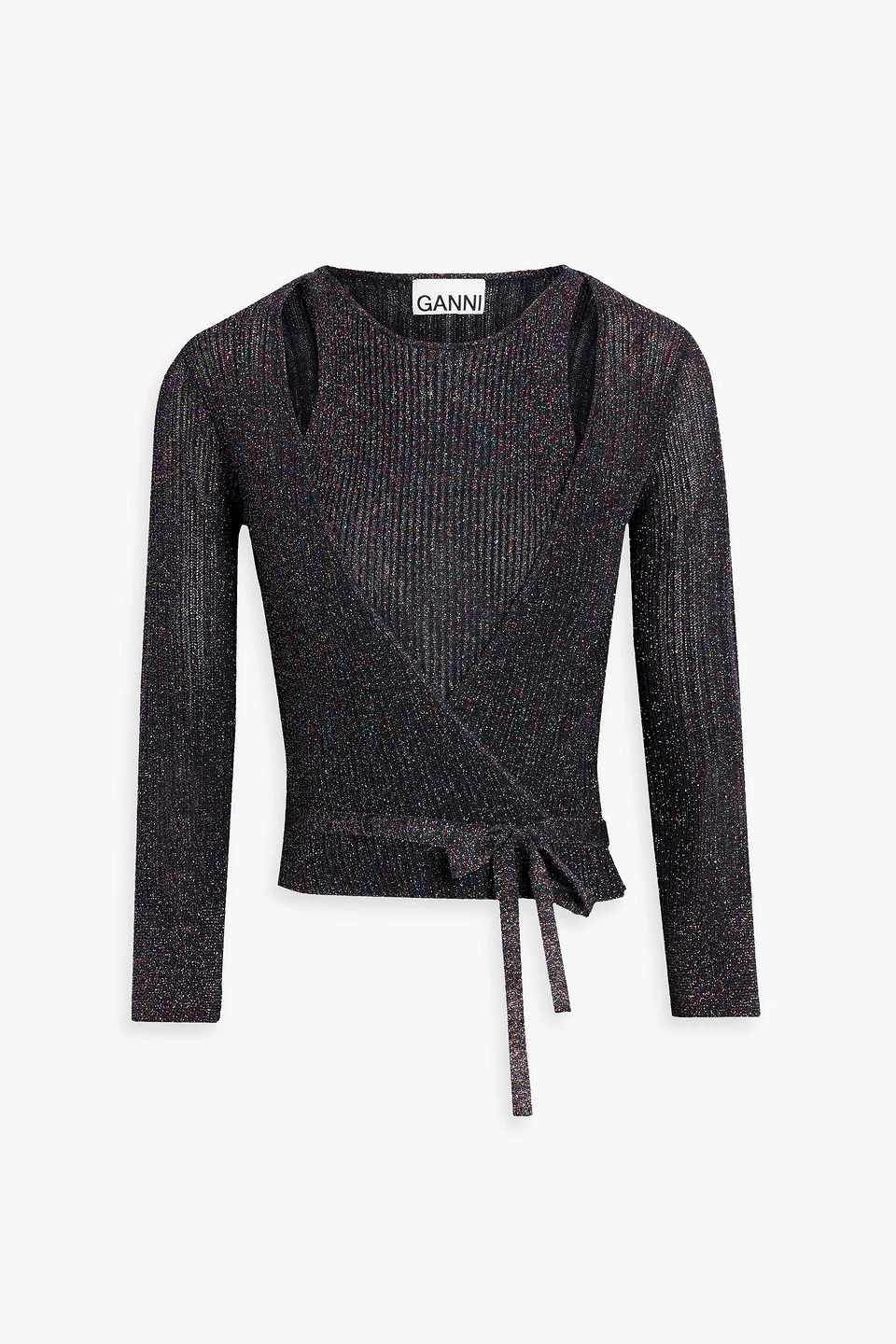Cutout wrap-effect metallic ribbed-knit top