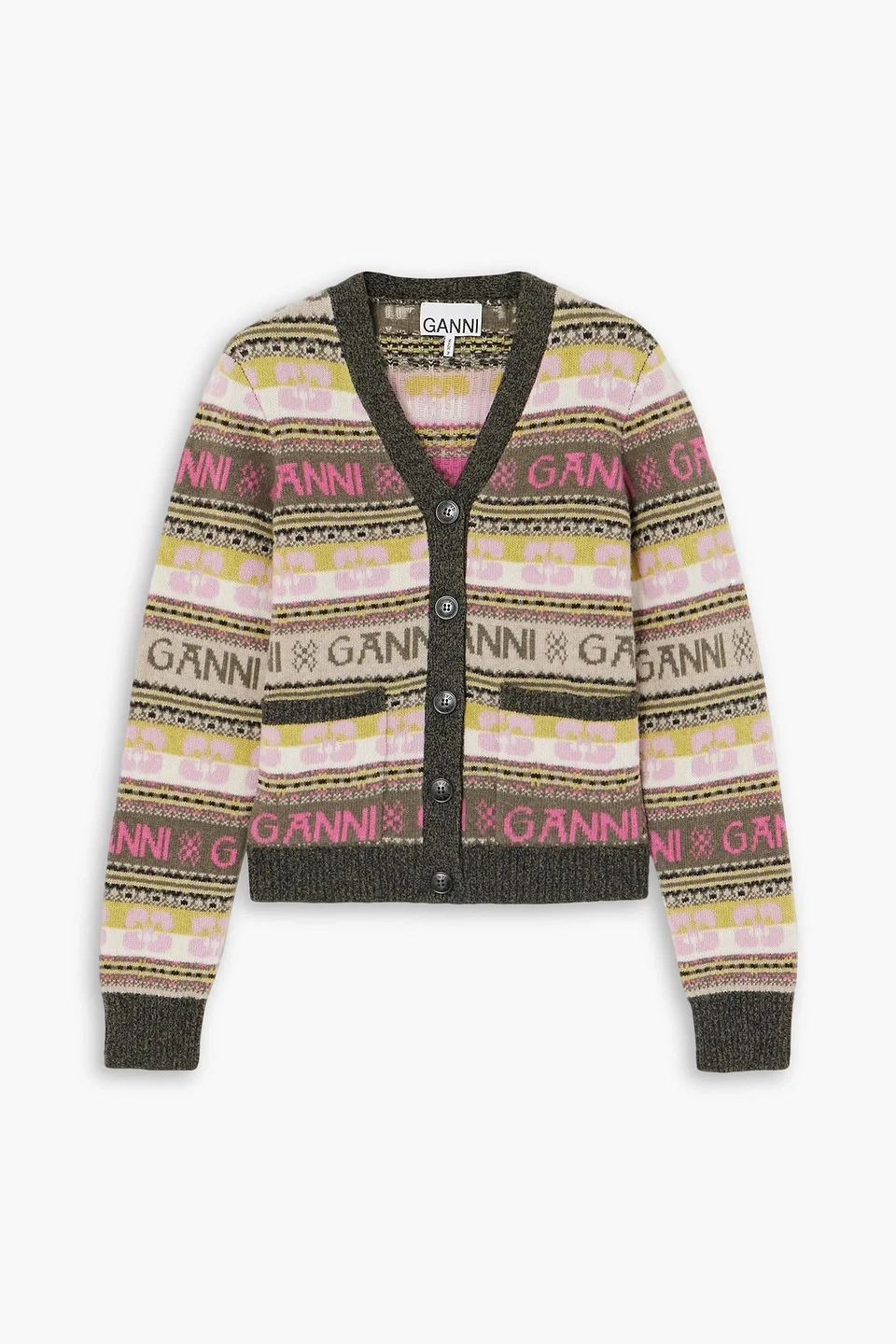 Cardigan intarsia-knit wool-blend ribbed trims two front patch pockets button fastenings through front mid-weight knit hand wash or dry clean imported GANNI's folksy cardigan will look equally lovely worn with jeans or layered over one of the label's signature frilly collars. Knitted from melange wool-blend, it's striped in neutral shades with pops of pink and yellow and intarsia-woven with the label's moniker. 45% Wool 35% Recycled wool 20% Recycled polyamide Product Code 1647597347165214