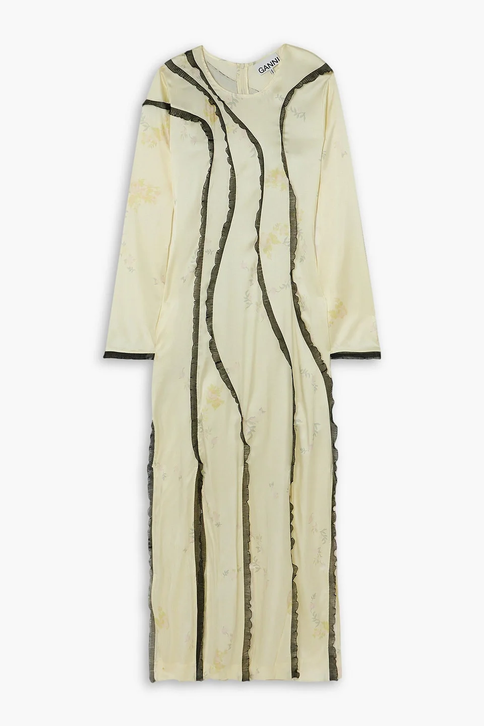 Dress floral-print stretch-silk satin lace trims front and side splits concealed zip fastening along back lightweight, stretchy fabric hand wash imported GANNI's maxi dress is cut from stretch silk satin that's subtly printed with soft flowers. The wavy rows of ruffled black lace are as fine as butterfly wings. Complement the split hem with ballet flats, as styled on the runway. 92% Organic silk 8% Elastane Product Code 1647597347127549