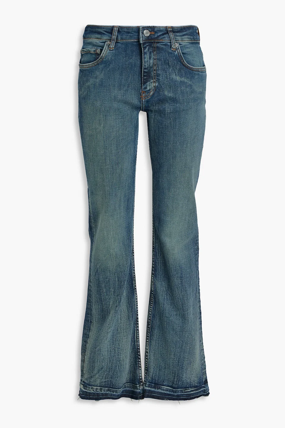 Flared jeans faded denim belt loops mid-rise cut five pockets button and concealed zip fastening at front frayed cuffs mid-weight, stretchy fabric machine wash imported 98% Organic Cotton 2% Elastane Product Code 46376663162835983