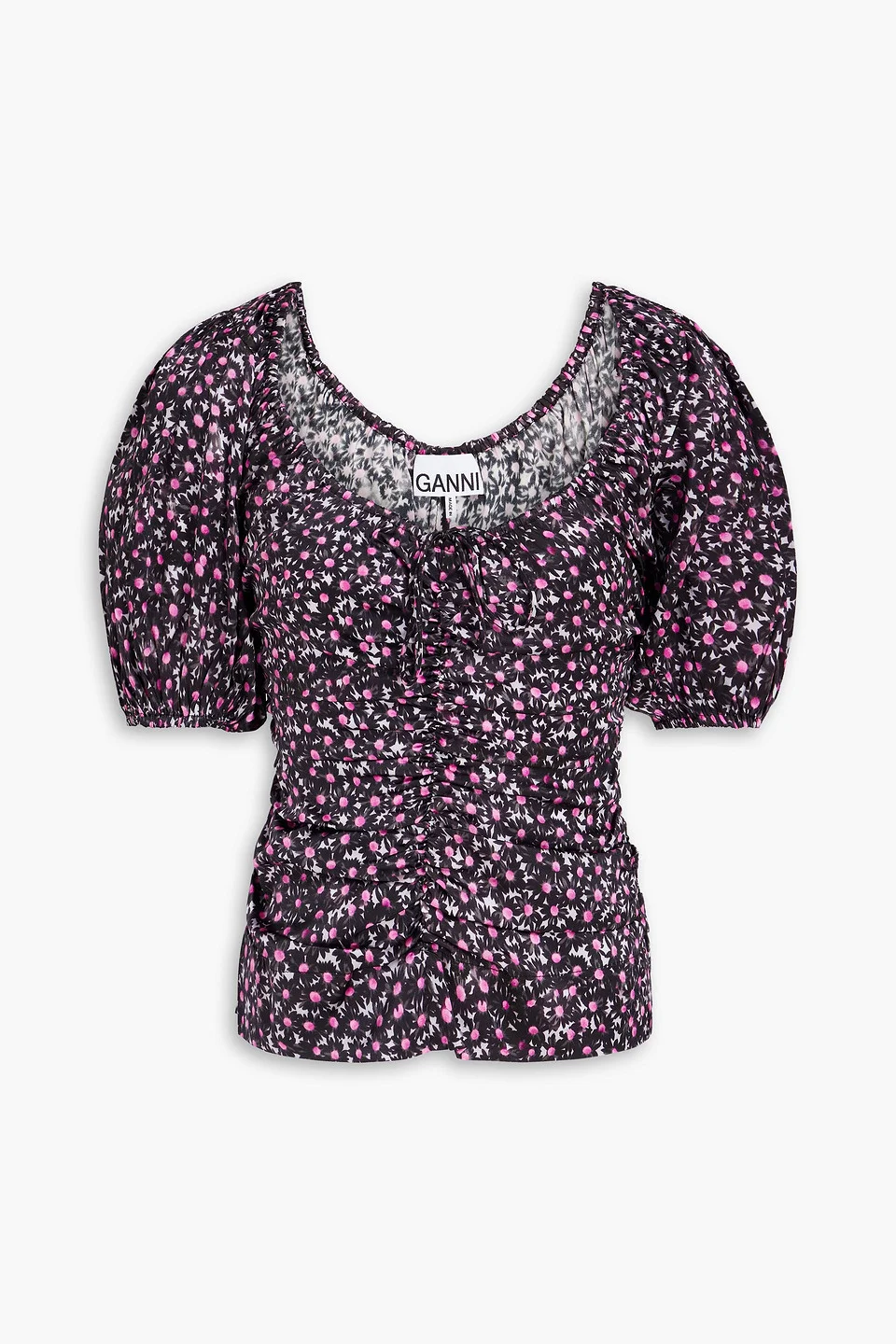 Ruched floral-print stretch-silk satin top