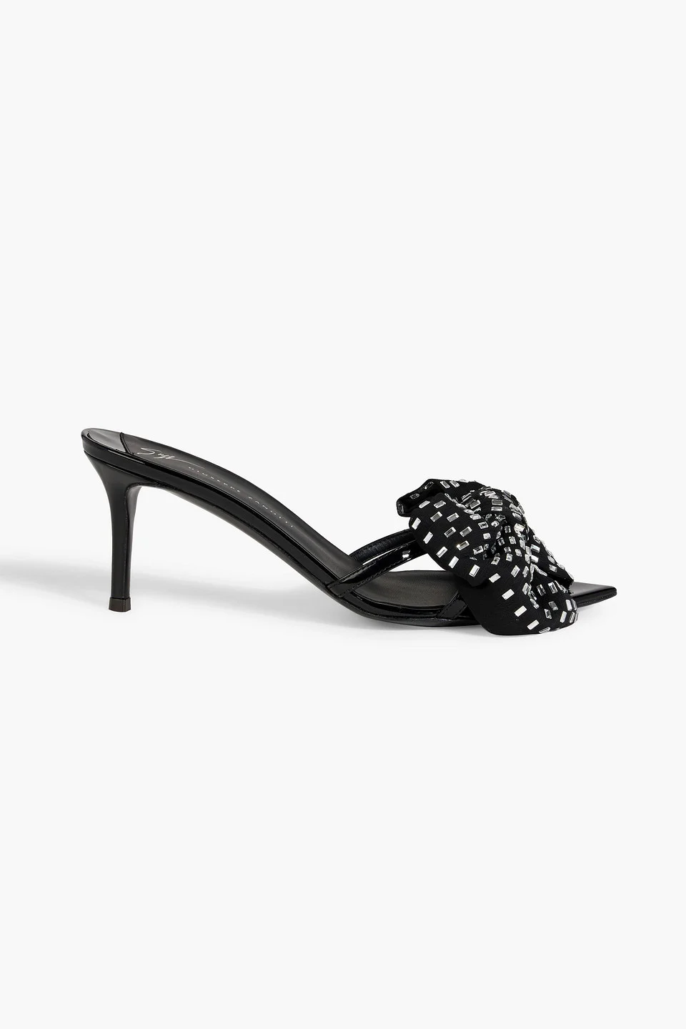 Mules glossed synthetic material crystals bow-detailed open pointed toe slip on leather sole made in italy 100% Textile fibers Product Code 1647597356831512