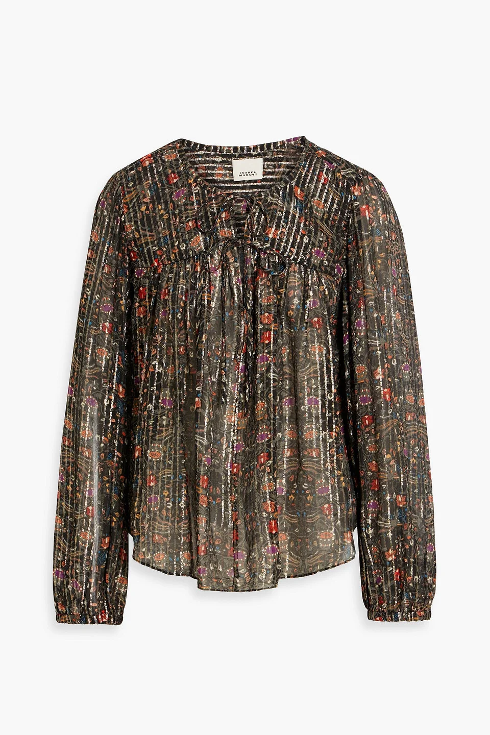 Blouse printed metallic fil coupe silk and lurex®-blend elasticated cuffs tie-fastening keyhole at front lightweight, non-stretchy fabric dry clean imported 84% Silk 16% Lurex® Product Code 46376663162923797