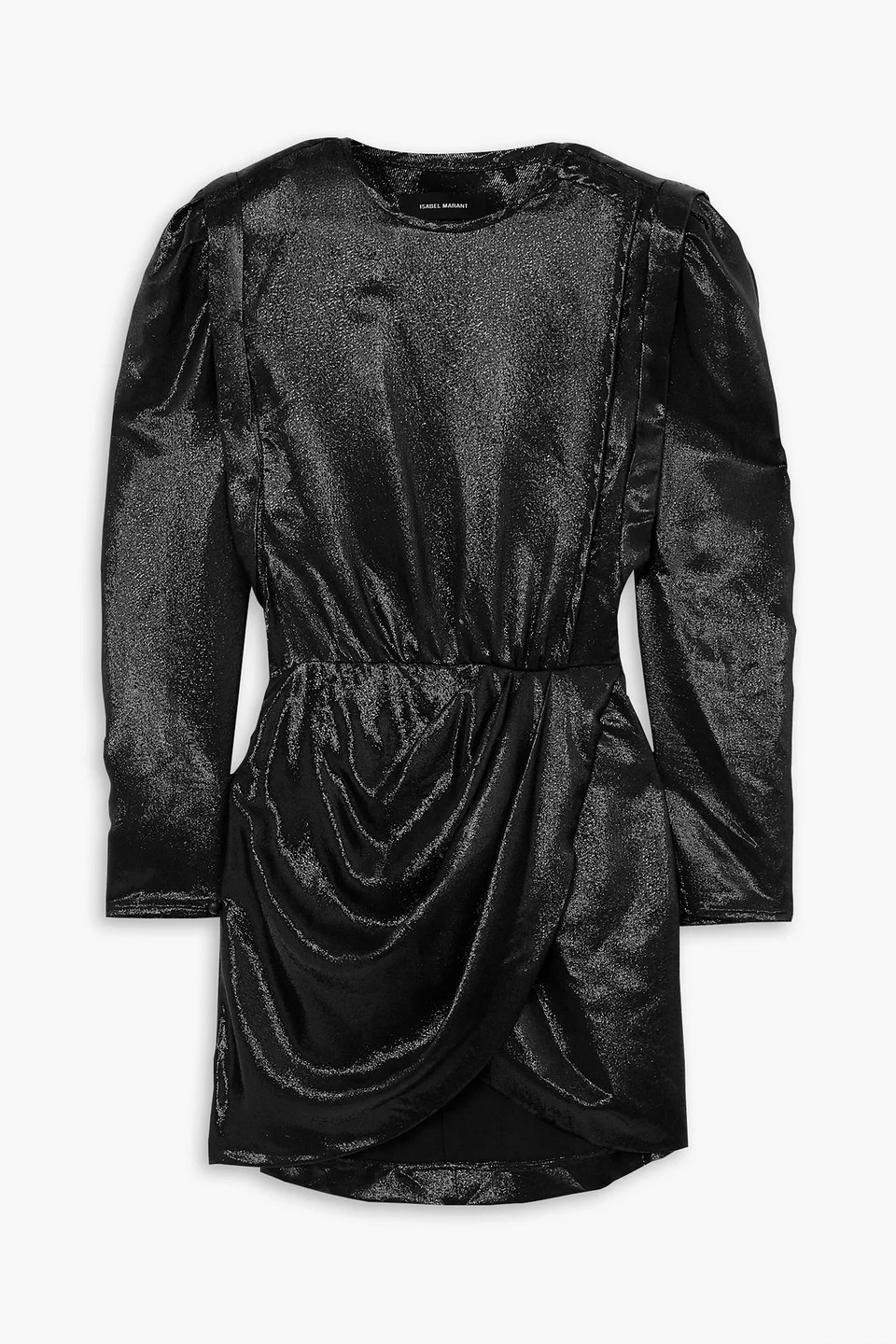 Dress metallic silk-blend shoulder pads draped gathered buttoned cuffs concealed snap fastenings along front concealed zip fastening along side non-stretchy fabric lightweight fabric dry clean imported 63% Silk 37% Polyester Product Code 1647597305165378