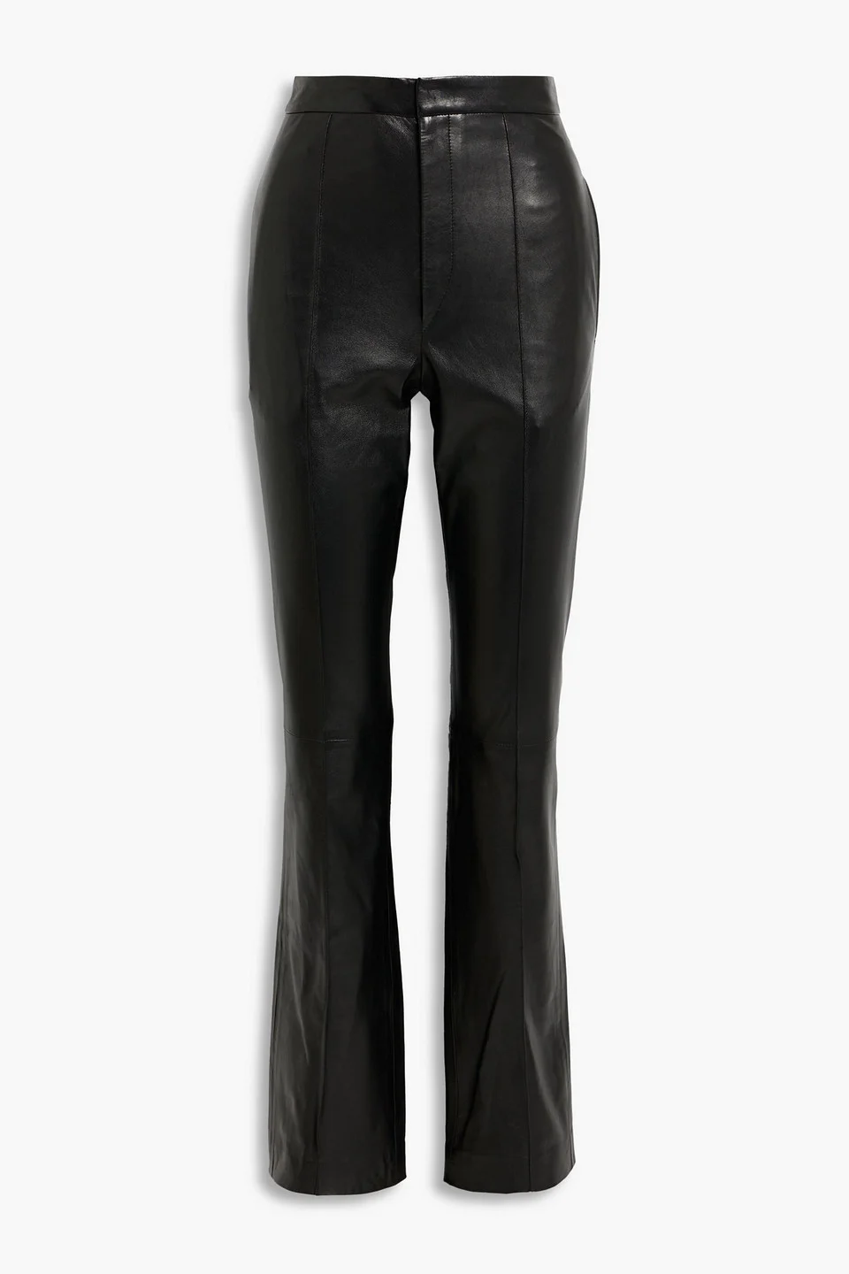 Straight-leg pants leather stitched front creases two side slit pockets two back welt pockets high-rise cut concealed button, hook and zip fastening at side firm, slightly stretchy leather specialist clean made in france 100% Lambskin Product Code 1647597357235619