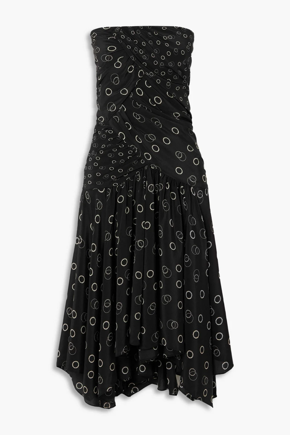 Strapless dress printed silk ruched handkerchief hem concealed hook and zip fastening at back partially lined mid-weight, non-stretchy fabric dry clean imported 100% Silk Product Code 1647597314116503