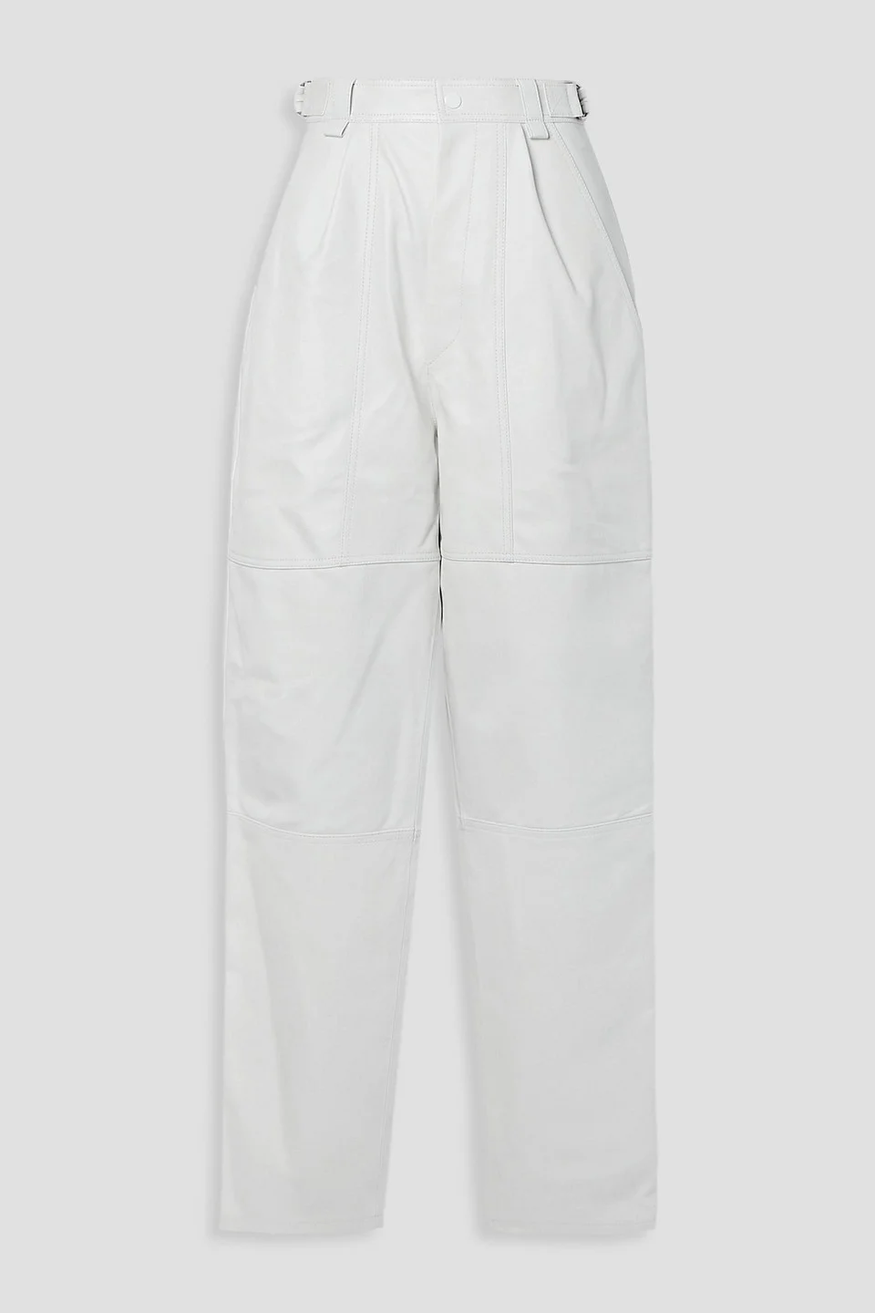 Tapered pants leather two side slant pockets two back welt pockets buckled waist tabs high-rise cut snap and concealed zip fastening at front supple, non-stretchy leather mid-weight fabric specialist clean made in france 100% Lambskin Product Code 1647597321840241