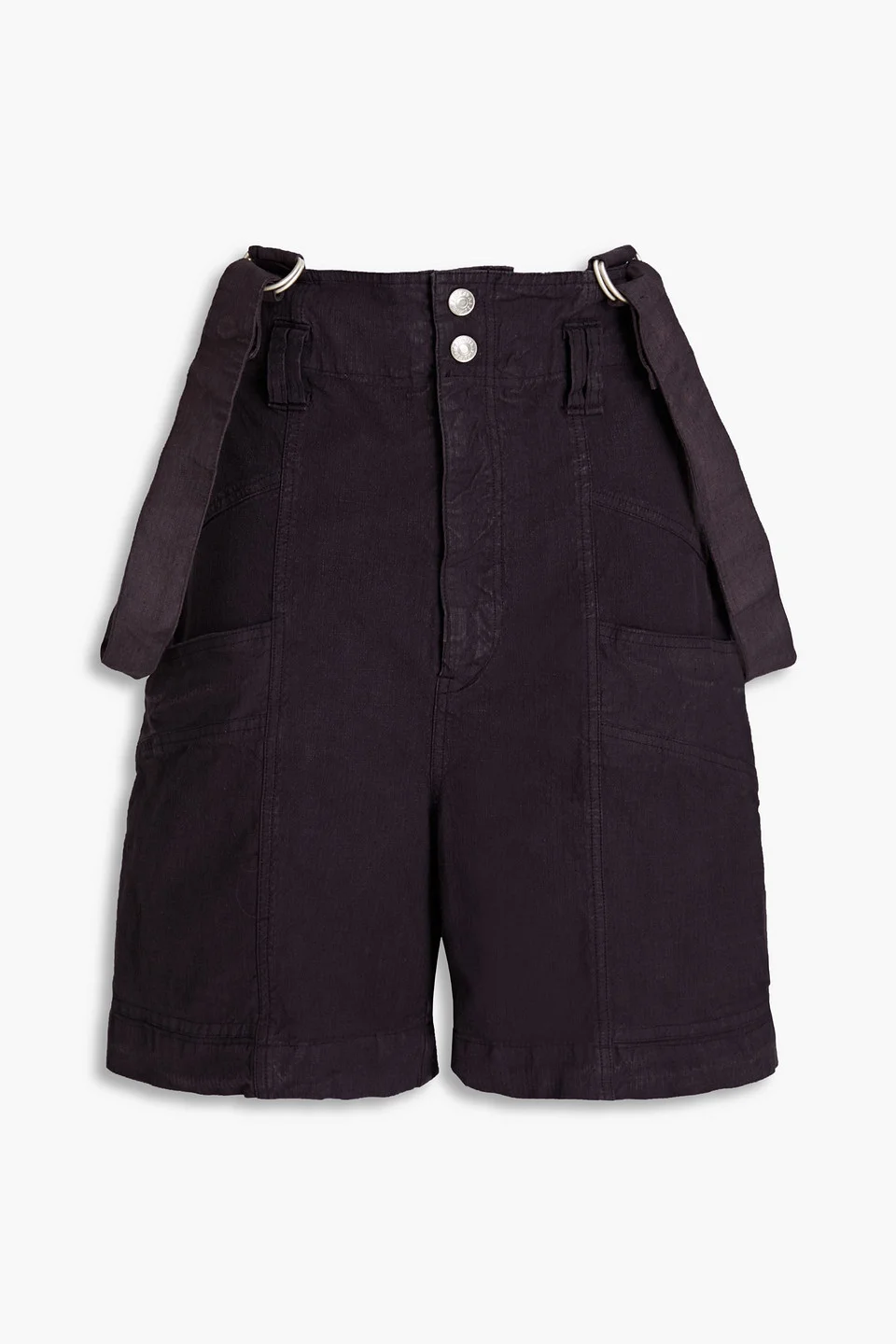 Shorts ripstop linen-blend waist belt high-rise cut removable suspenders two front slant pockets two back patch pockets snap and concealed zip fastening at front mid-weight, non-stretchy fabric dry clean imported 51% Linen 47% Cotton 2% Elastane Product Code 1647597330222899