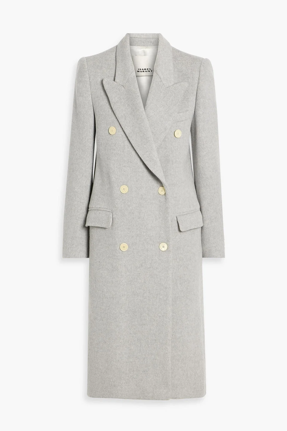 Coat wool-blend felt buttoned cuffs front flap pockets breast pocket back vent button fastenings through double-breasted front mid-weight, non-stretchy fabric dry clean imported 83% Virgin Wool 15% Cashmere 2% Polyamide Product Code 46376663162923596