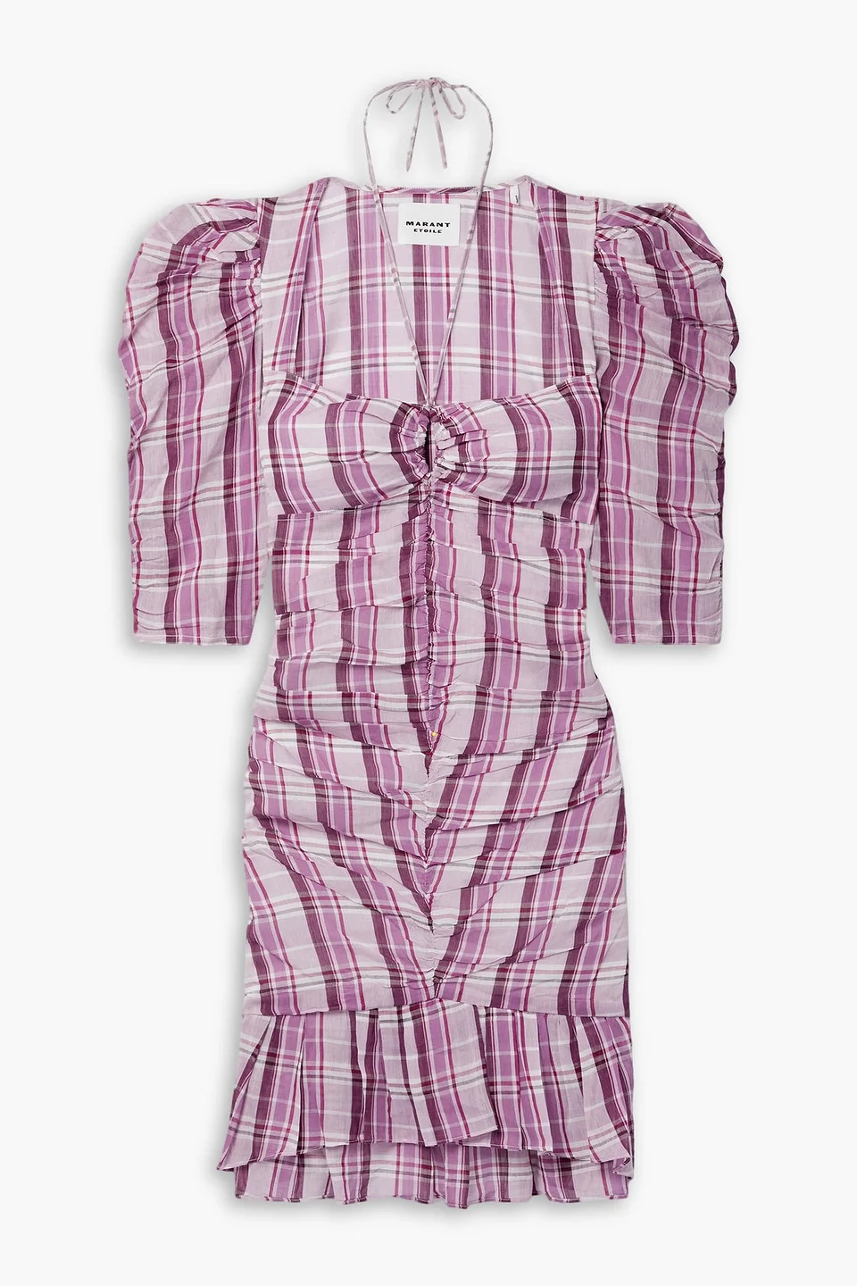 Dress checked cotton-voile ruched ties at neck concealed zip fastening along side lightweight, non-stretchy fabric machine wash or dry clean imported Isabel Marant Etoile's 'Galdino' dress is made from airy cotton-voile decorated with colorful checks and ruched throughout for texture. It's designed with puffed sleeves and a ruffled hem. The slim ties can be left to drape or tied to create a halterneck. 100% Cotton Product Code 1647597348321940