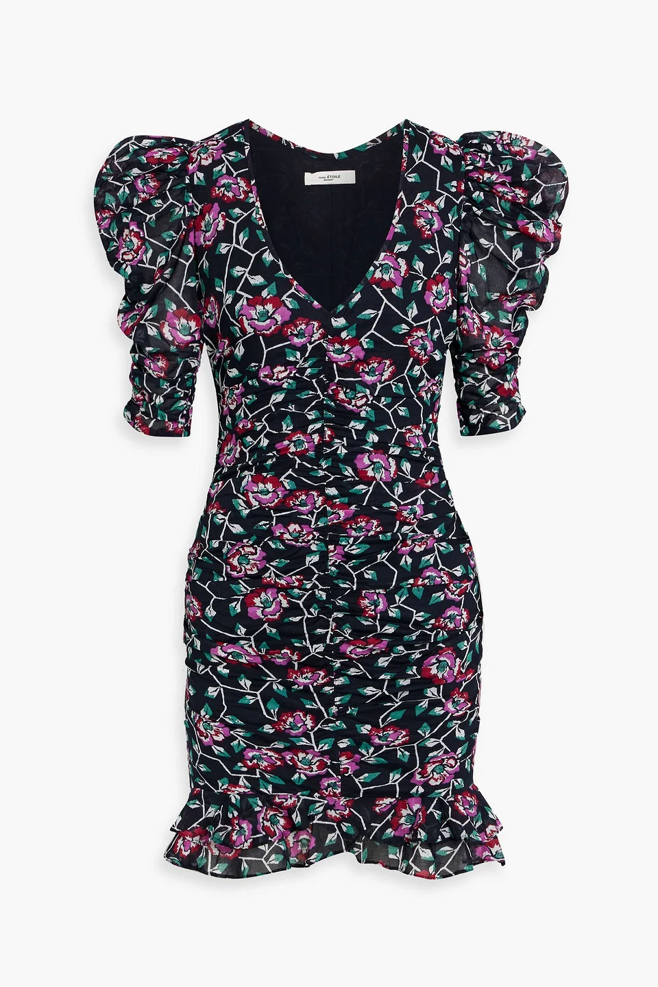 Dress floral-print cotton-voile ruched puffed sleeves concealed zip fastening along side fully lined lightweight, non-stretchy fabric dry clean imported 100% Cotton Product Code 46376663162923233