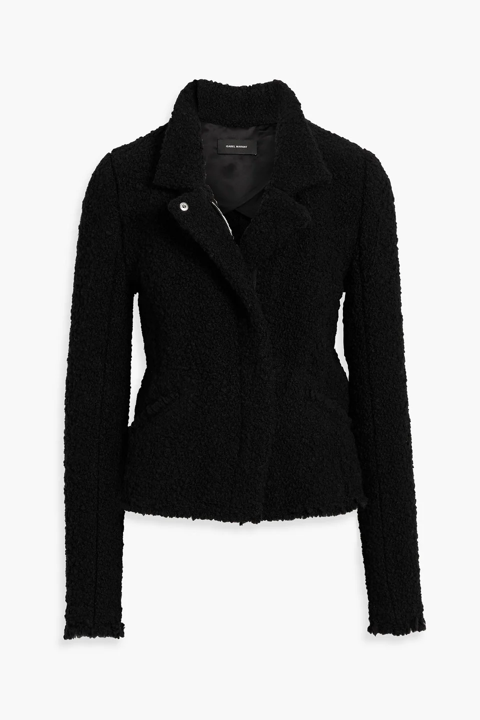 Jacket boucle front slant pockets concealed snap and zip fastenings through front mid-weight, non-stretchy fabric dry clean imported 46% Acrylic 38% Wool 16% Polyester Product Code 46376663162923209