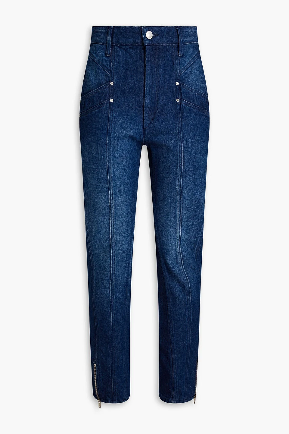 Slim-leg jeans faded denim belt loops high-rise cut multipockets button and concealed zip fastening at front zips at hem non-stretchy fabric mid-weight fabric dark wash machine wash or dry clean imported 100% Cotton Product Code 1647597286364175