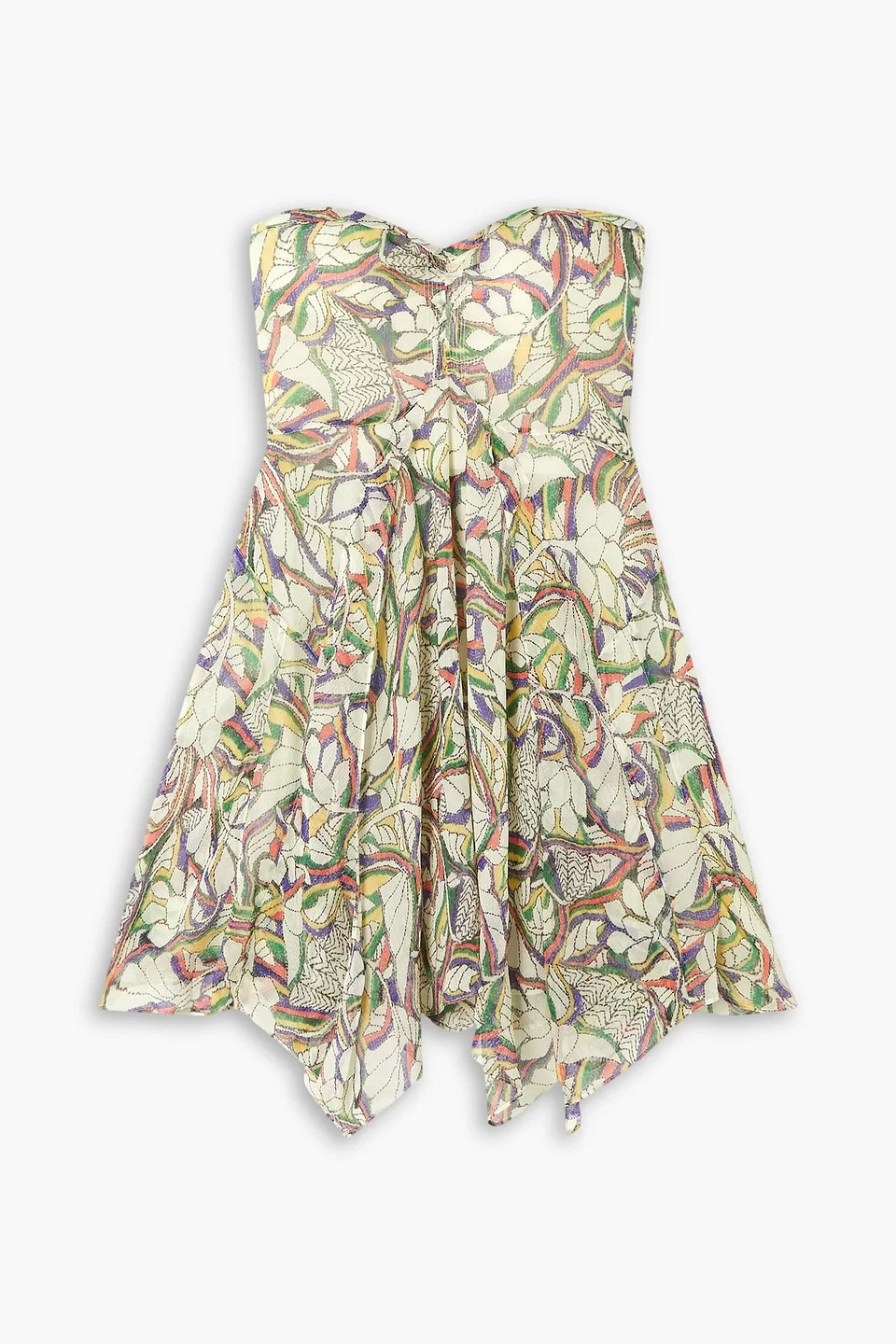 Strapless dress floral-print silk-crepon ruched ruffled hem concealed zip fastening along side fully lined lightweight, non-stretchy fabric dry clean imported Isabel Marant's 'Louane' mini dress flutters effortlessly as you walk. Cut from airy silk-crepon printed with colorful florals, it has a strapless bustier neckline that you could complement with a dainty chain or pendant. 100% Silk Product Code 1647597346406103