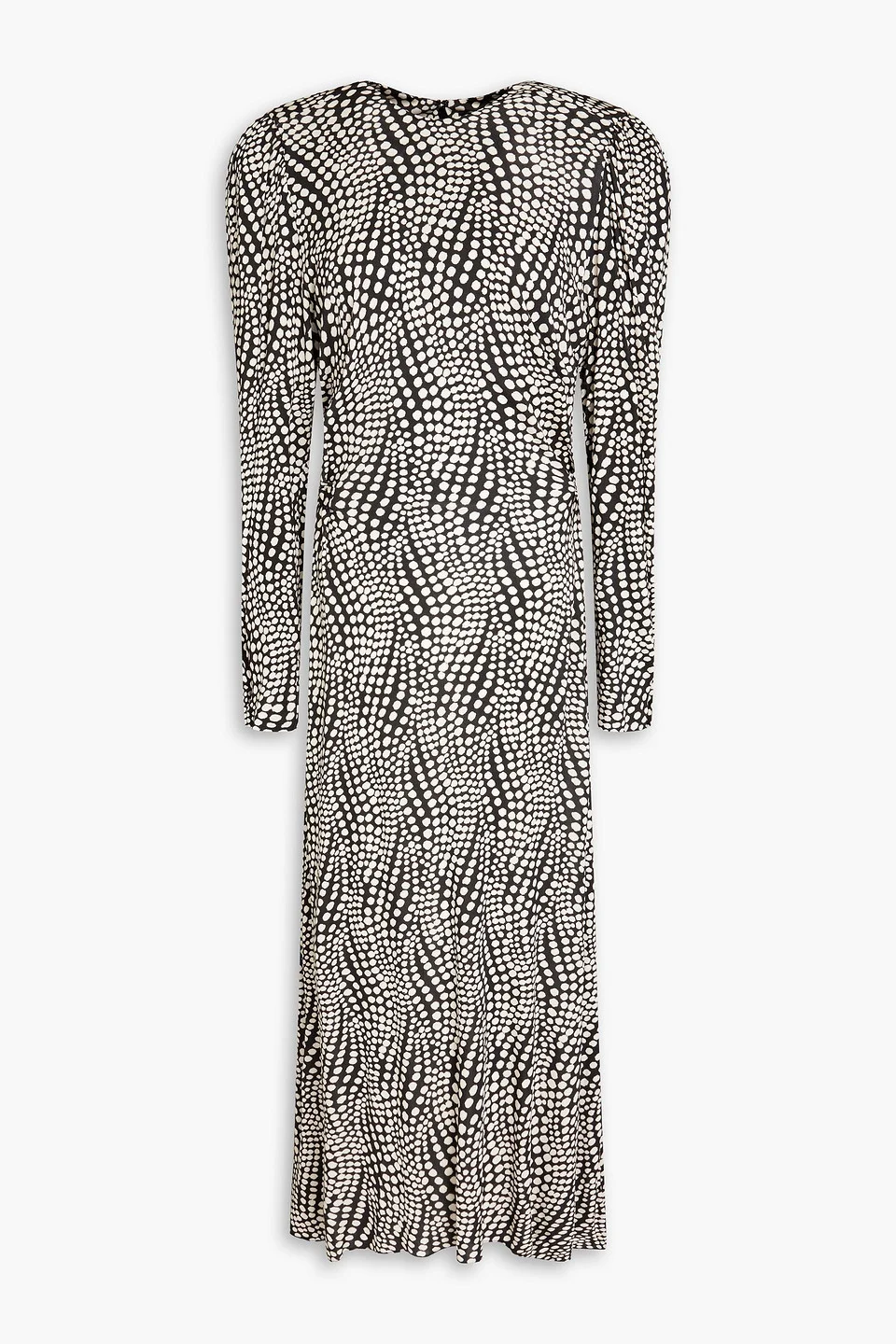 Dress polka-dot jersey shoulder pads waist ties snap-fastening cuffs concealed hook and zip fastening at back dry clean imported 100% Viscose Product Code 1647597330733941