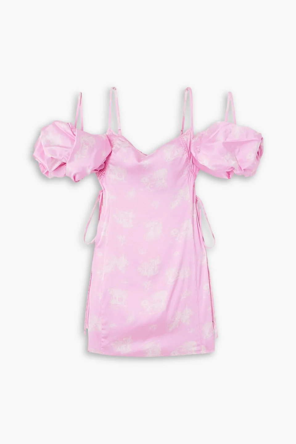 Dress printed satin adjustable straps convertible detachable sleeves puffed sleeves concealed hook and zip fastening at side lightweight, slightly stretchy fabric dry clean imported Simon Porte Jacquemus approaches volume with a playful tone for this mini dress. Made from satin, it has detachable puffed sleeves and signature lingerie-style straps. Borrow the styling from the runway and style yours with lace tights. 96% Viscose 4% Elastane Product Code 1647597346671472