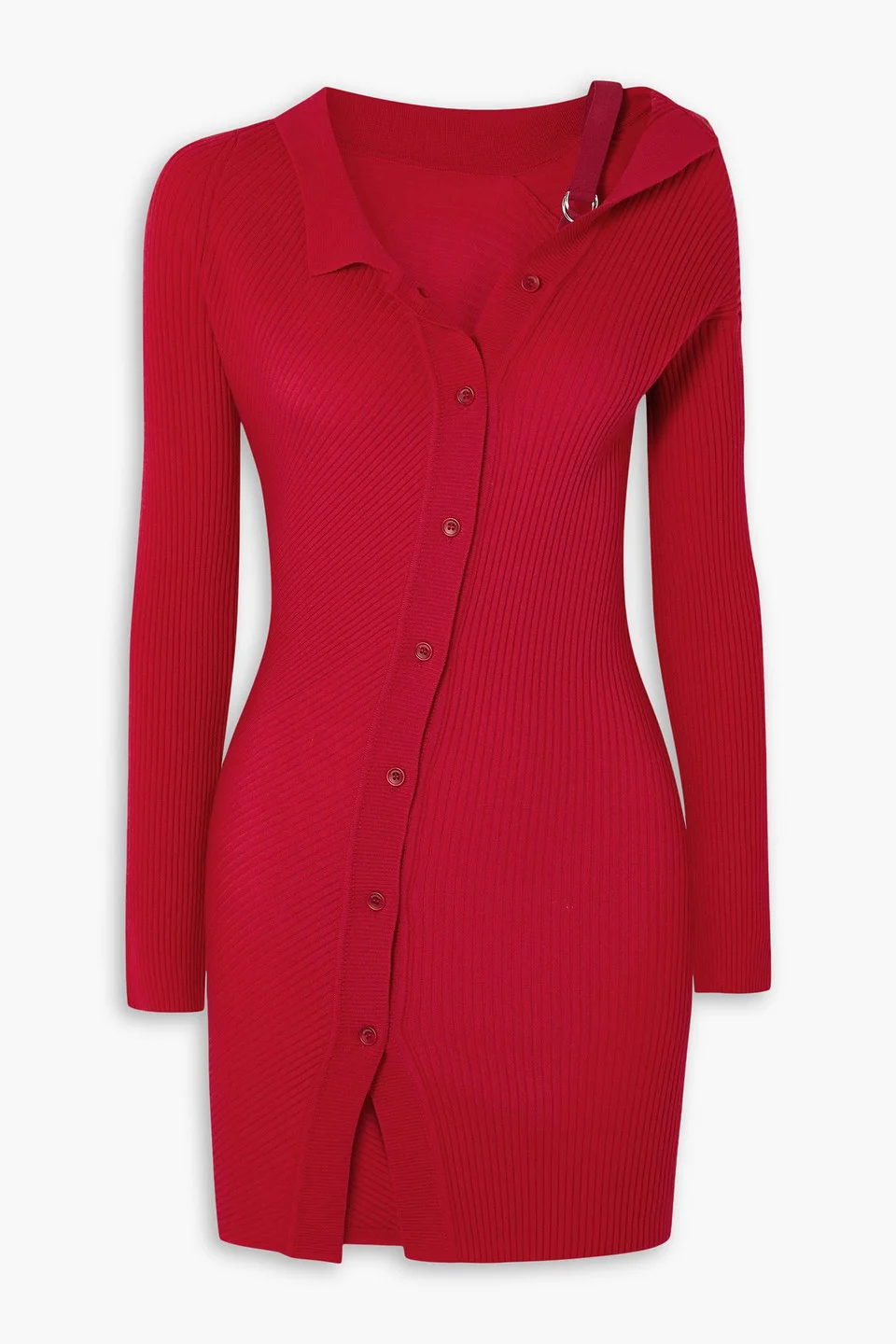 Dress wool-blend ribbed asymmetric button fastenings through front mid-weight knit dry clean imported If you're looking to add a pop of color to your wardrobe, choose red. Rib-knitted from wool-blend, Jacquemus' 'Colin' mini dress has a grosgrain strap with the lineup's new silver hardware. Keep the fabric looking its brightest by hand washing it in cold water with a natural detergent. 82% Wool 17% Polyamide 1% Elastane Product Code 1647597346614213