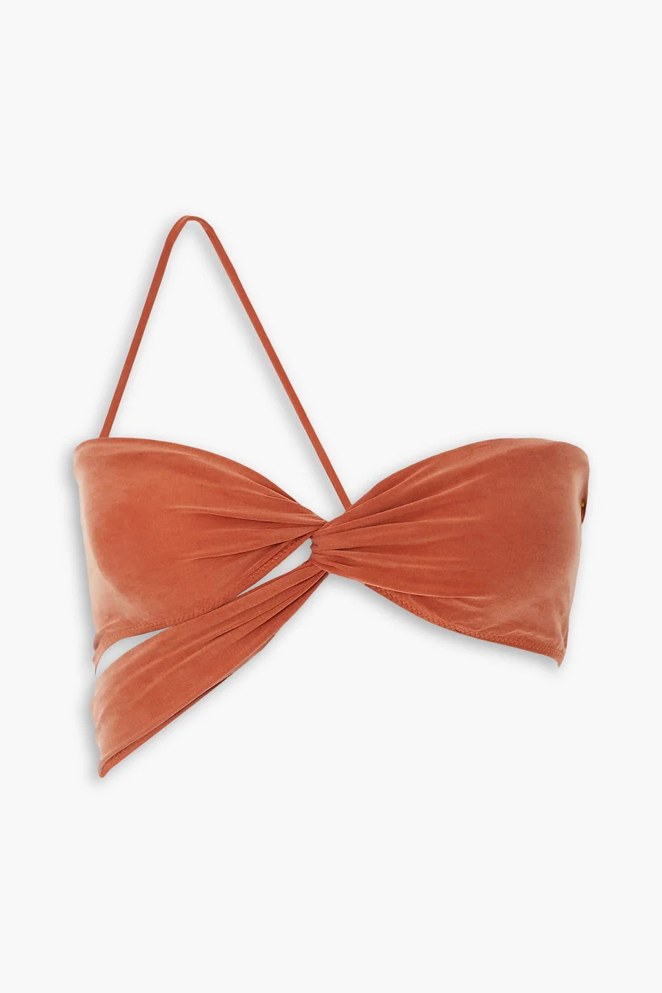 Top stretch-jersey cupro-blend cropped asymmetric hook-fastening keyhole at back mid-weight, stretchy fabric dry clean imported Jacquemus' vision of everyday lingerie is showcased with this slinky bandeau top. Debuted in Paris as part of the 'Le Raphia' collection, this asymmetric style is artfully knotted and spliced with cutouts. It's made from stretch-jersey and turns to reveal a glossy clasp. 93% Cupro 7% Elastane Product Code 1647597346921011